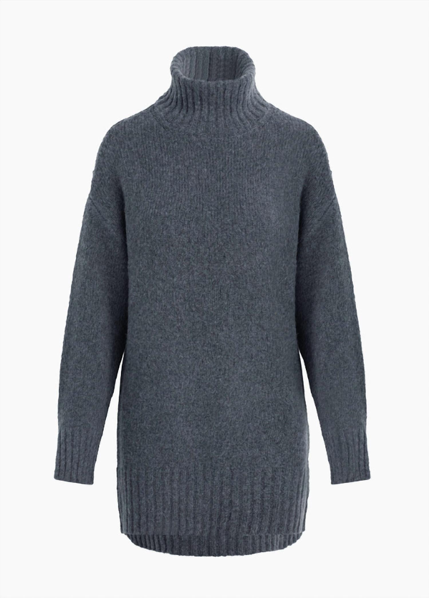 A short and breezy dress for those warmer days. Embrace effortless elegance with the St. James Dress by Favorite Daughter, perfect for travel and designed in a chic London Fog shade. This women's mini dress in a solid pattern is crafted from a soft, cozy wool-cashmere blend, featuring a ribbed turtleneck, drop shoulders, and slit long sleeves for a preppy, laid-back style. The dress is pull-on for convenience, and its 31.75" length enhances its relaxed sheath silhouette, making it ideal for the fall season. Mia is 5'9.5" and models the XS size.
