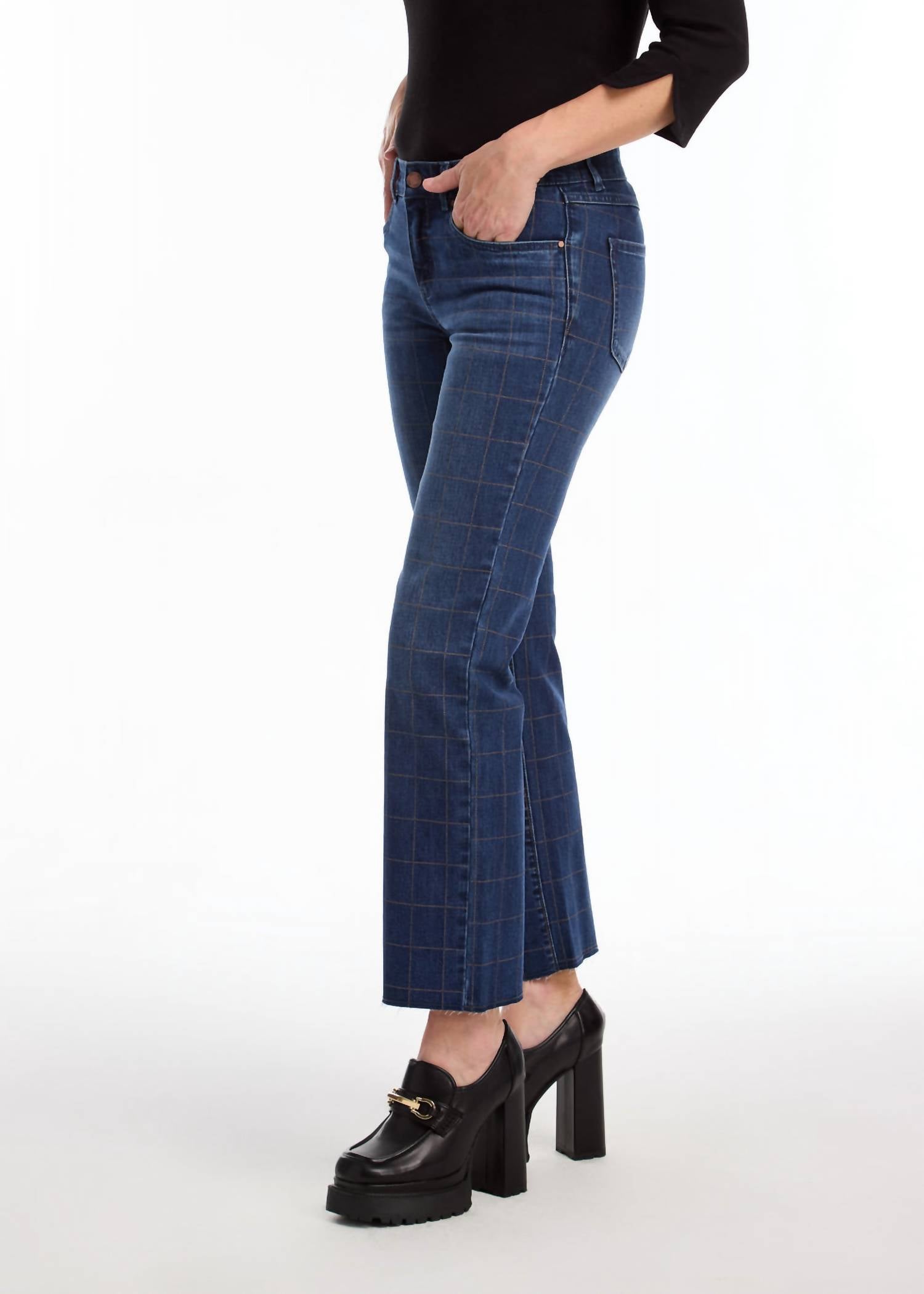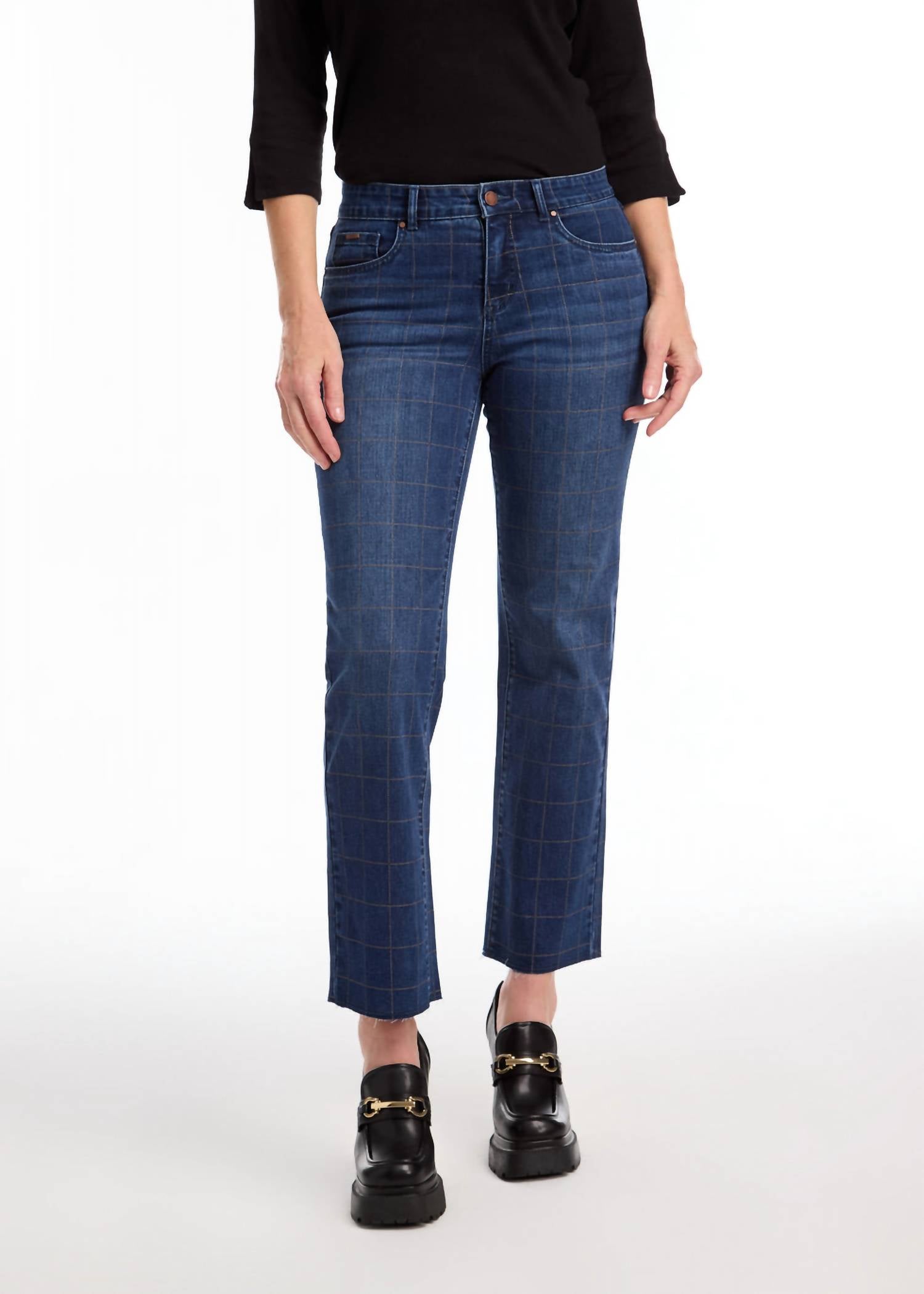 These must-have jeans are fit to perfection. Elevate your style with the Christina Plaid Straight Leg Jeans by FDJ, featuring a striking checkered pattern in a versatile medium wash. These jeans offer a relaxed fit with a high-rise waist and practical straight leg design, perfect for a sophisticated yet laid-back look. Crafted from a cotton blend consisting of 66% cotton, 20% polyester, 3% viscose, and 1% elastane, they ensure comfort with every wear. Closure: Button closure. Care: Machine wash and tumble dry. Enjoy the functional pockets and impeccable fit with a 28" inseam.