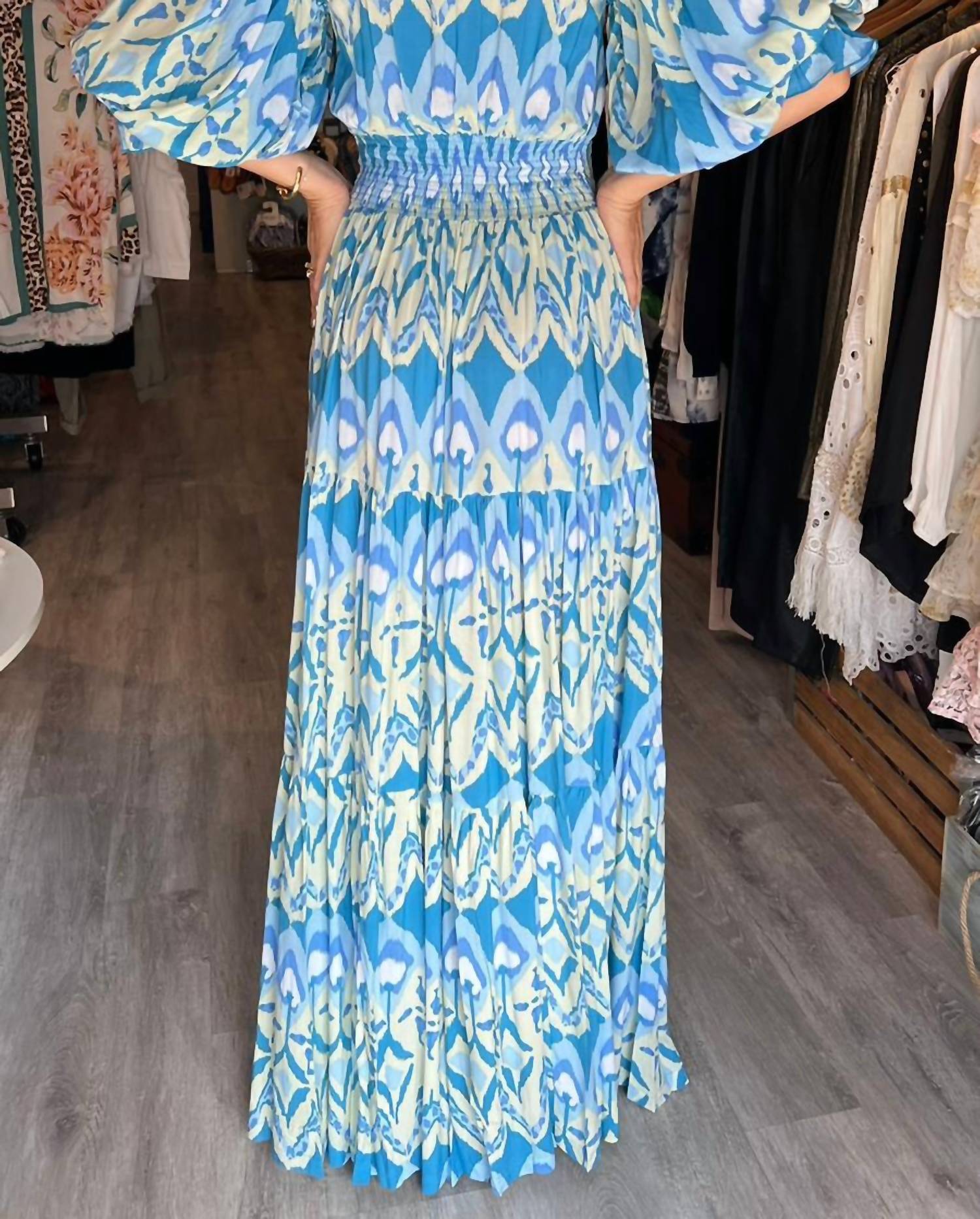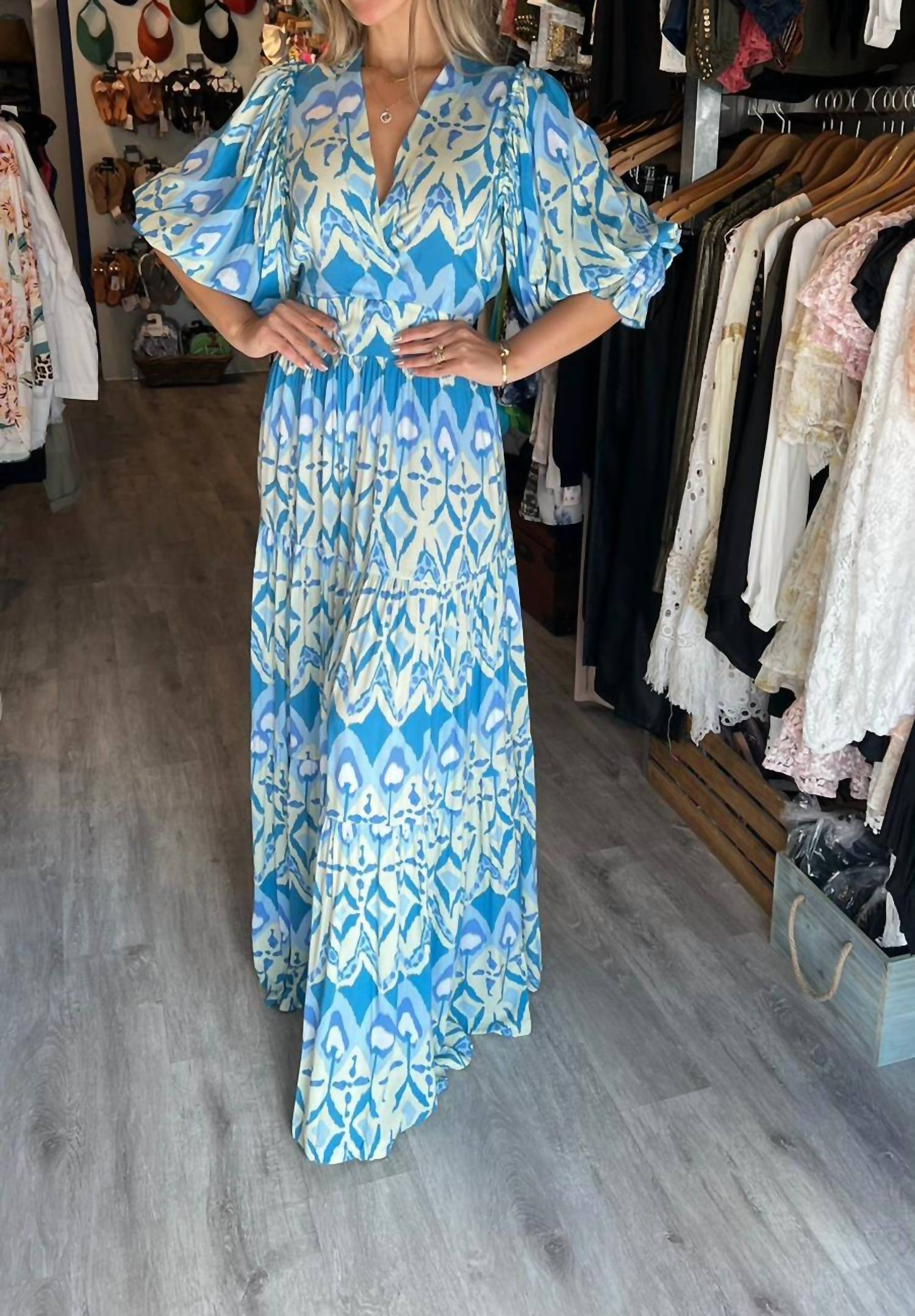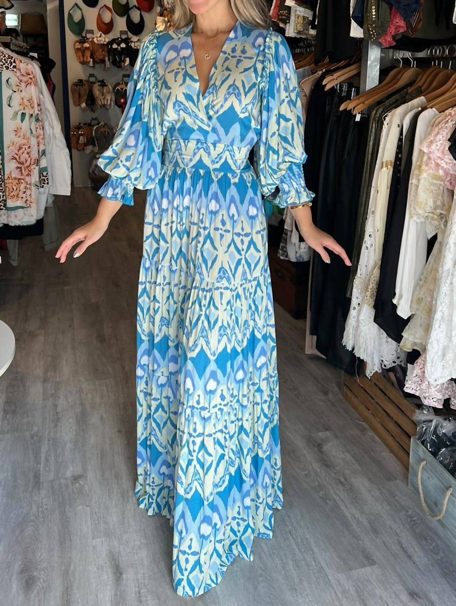 A maxi dress that is just as cute as it is comfortable. Discover the Orelia Maxi Dress by Feather & Find, an inspired creation reminiscent of a glamorous vintage era. This beautiful piece features three-quarter sleeves with flouncy ruffle trims and a flattering wrap-effect silhouette that falls into a tiered skirt. Crafted with a vibrant 'Hand of The People' print, this patterned dress is made for women seeking quiet luxury and ideal for spring vacations. Closure: Pull on. Care: Machine wash at 30 degrees and wash dark colors separately; warm iron when slightly damp or steam when dry.