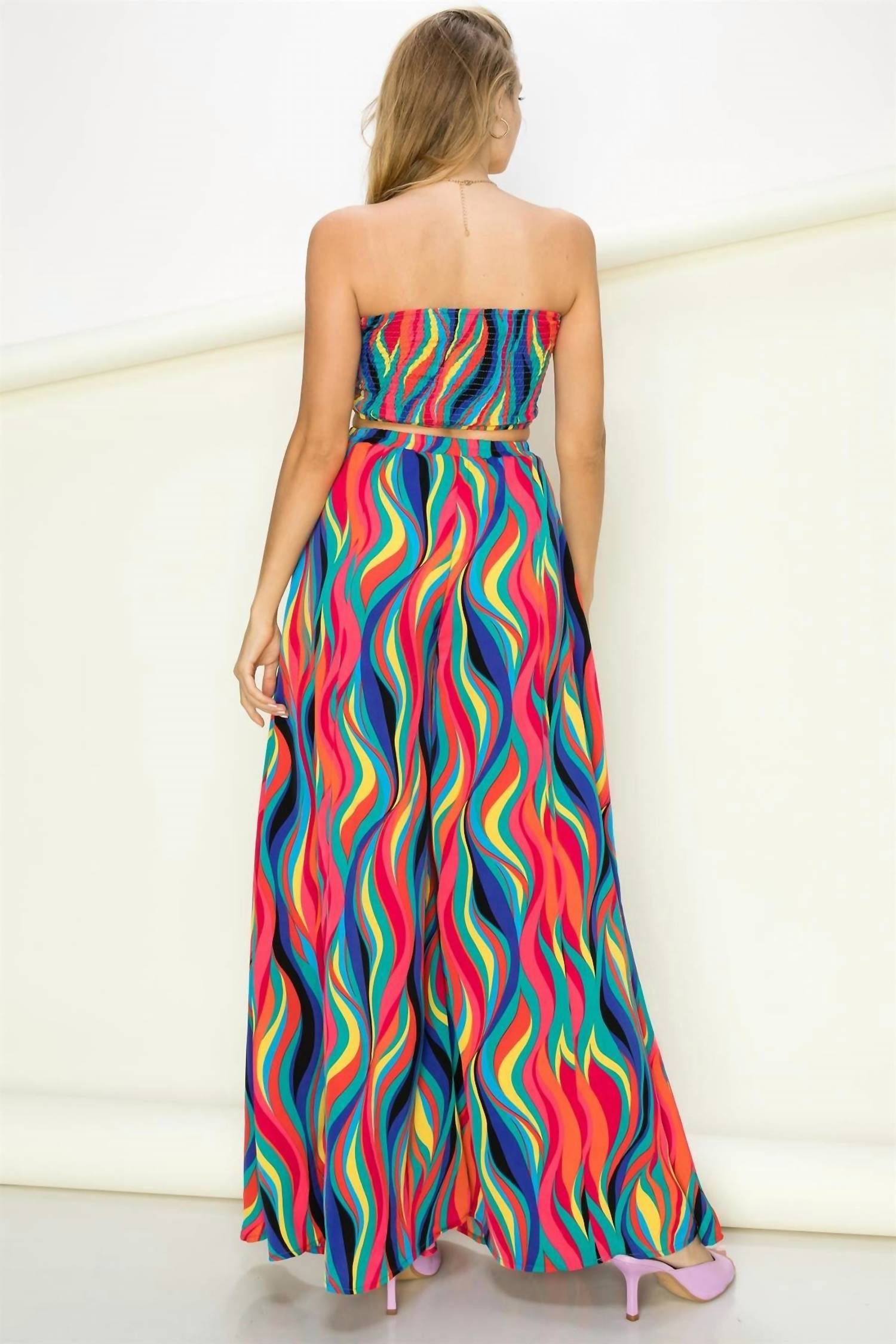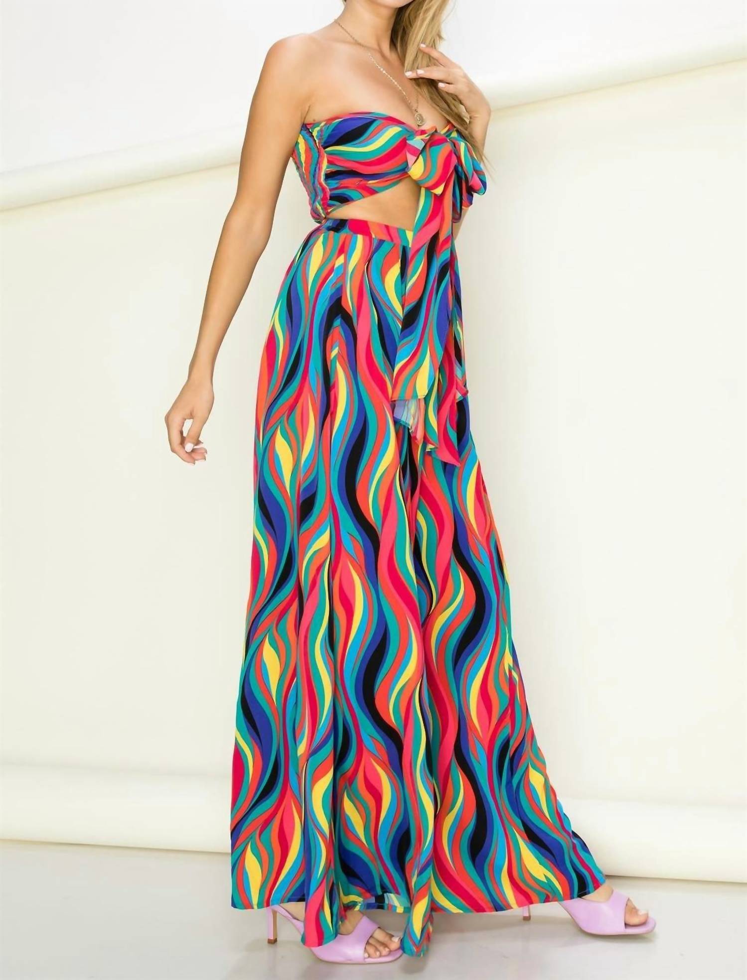 It doesn't take much for this one piece to look effortlessly cool. Add some statement jewelry to dress it up, or throw on some sneakers for a more casual vibe. Introducing the Duchess Tube Top and Palazzo Pants Set by Fiestar, a statement ensemble designed for a maximalist summer look. This multi-colored, patterned set features a front-tied tube top and wide-leg, high-rise palazzo pants, perfect for a relaxed beach day celebration. Made from polyester, it boasts a tie closure for the top and offers a comfortable relaxed fit. Care: Machine wash and line dry. Ideal for those looking to turn heads, especially on occasions like the 4th of July.