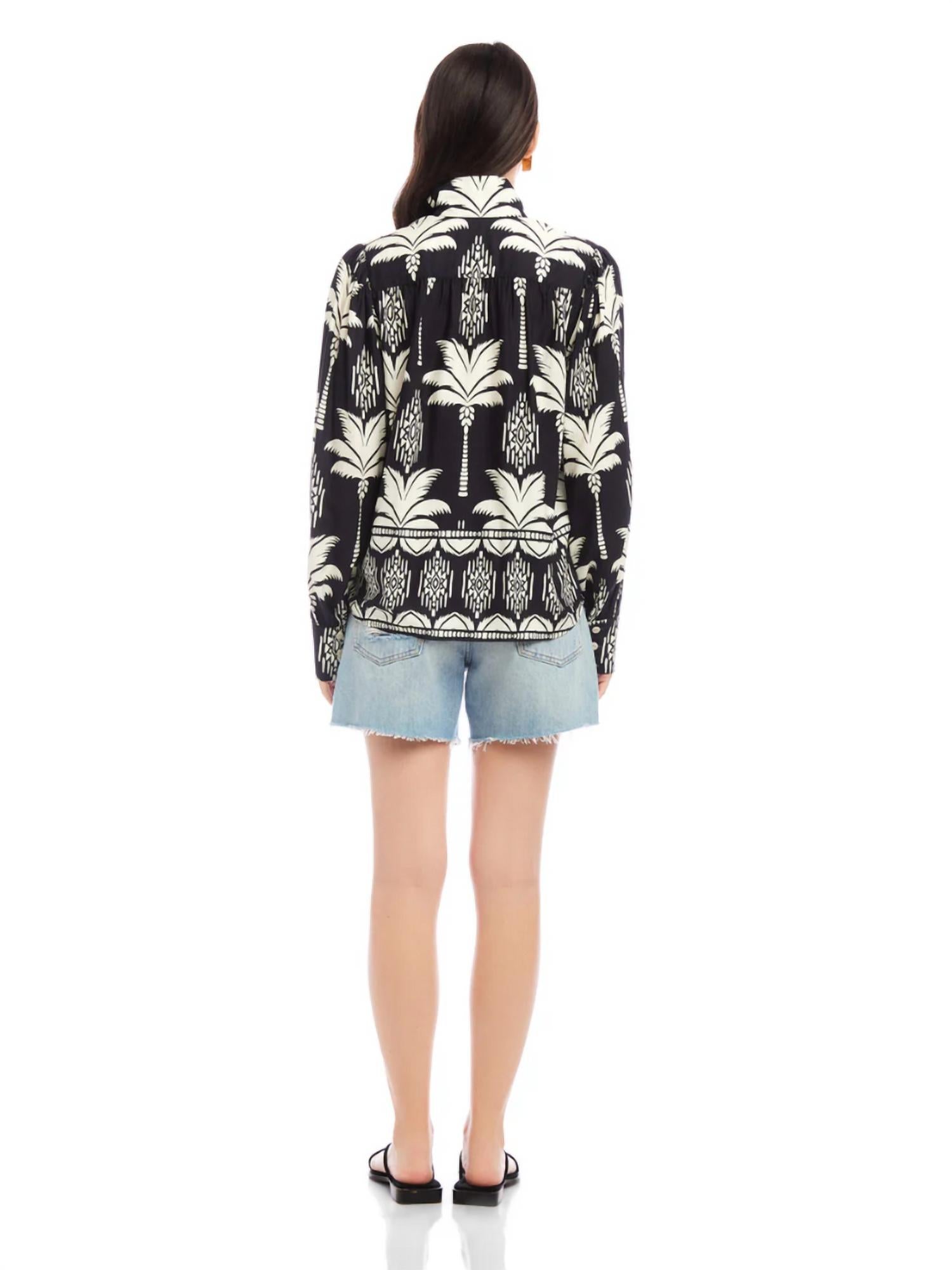 A versatile blouse that works from desk to dinner! Elevate your wardrobe with the Chloe Long Sleeve Blouse by Fifteen Twenty, a stylish choice in a sophisticated black and cream pattern. This piece features long sleeves and a classic collar, crafted from 100% Viscose with a refined Royal Palm Viscose Twill Print. Made in the USA from luxurious Italian fabric, it offers a length of 25 inches in size S. Closure: Button closure with fish eye buttons. Care: Dry clean only.