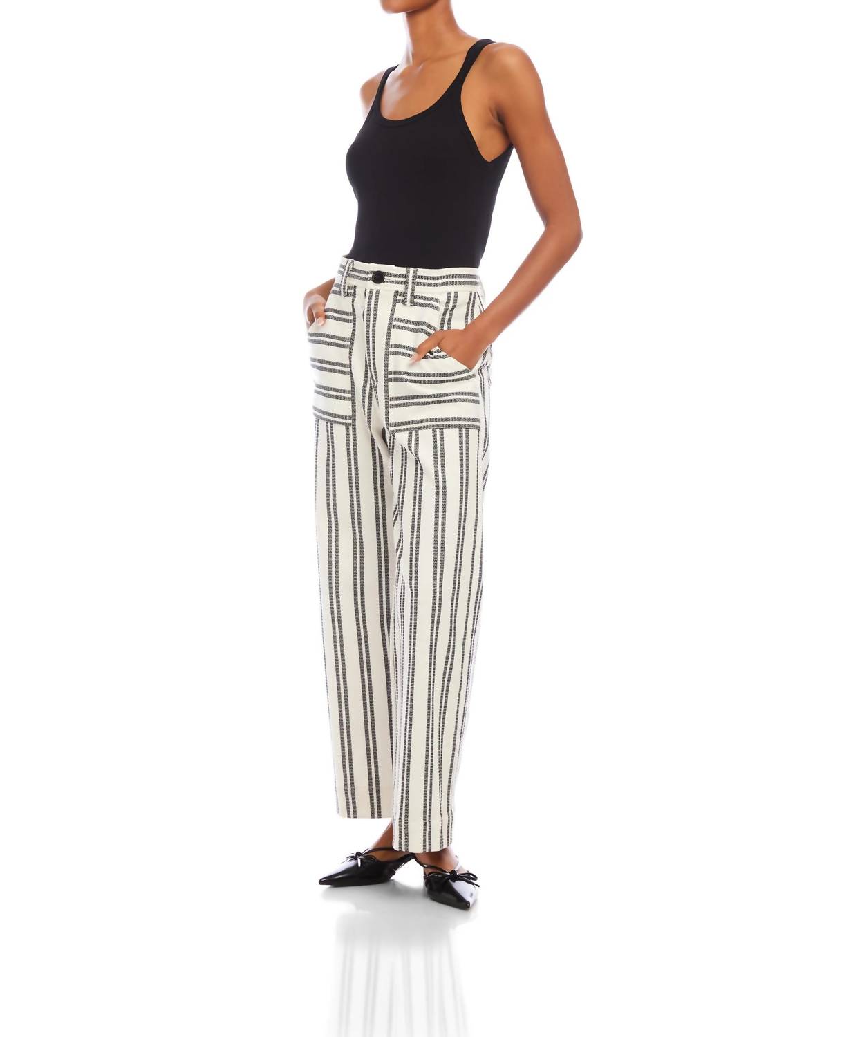 Elevate your wardrobe with the Rylee Cropped Pants by Fifteen Twenty, featuring a stylish black stripe pattern. These wide-leg pants offer a flattering high-rise fit, with a front rise of 12.375 inches and an inseam of 28 inches, ensuring a tailored and chic look. Crafted from a cotton blend of 98% cotton and 2% elastane, they offer a breathable and comfortable wear. Closure: Zip closure with front button and zipper, plus functional belt loops. Care: Machine wash cold and line dry or opt for dry cleaning. With two front pockets, these pants perfectly blend functionality with minimalist style, ideal for both casual and polished occasions.