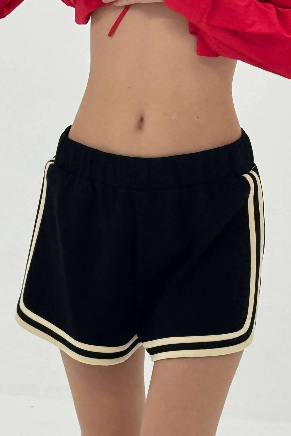 Fit to perfection, we love these high-waist shorts and you will too. The Trackstar Shorts by Find Me Now offer a sport-inspired style in versatile black with a contrast waistband and side stripes. These high-waisted shorts, made from a comfortable Viscose Blend, feature a pull-on closure and are ideal for active summer days. Designed for a comfort fit, they boast a stretchy jersey ponte fabric that retains its shape, while the double-knit material remains smooth and wrinkle-resistant. Care is simple with hand washing and laying flat to dry, making them perfect for holiday parties or casual outings.