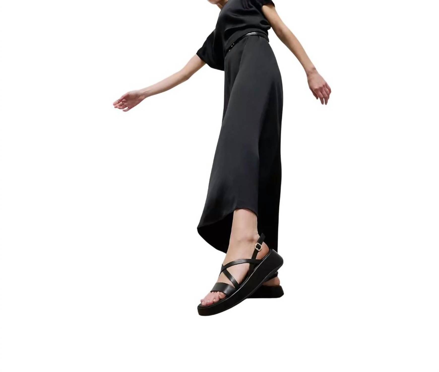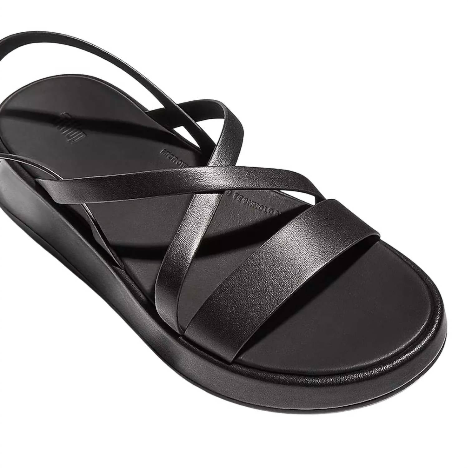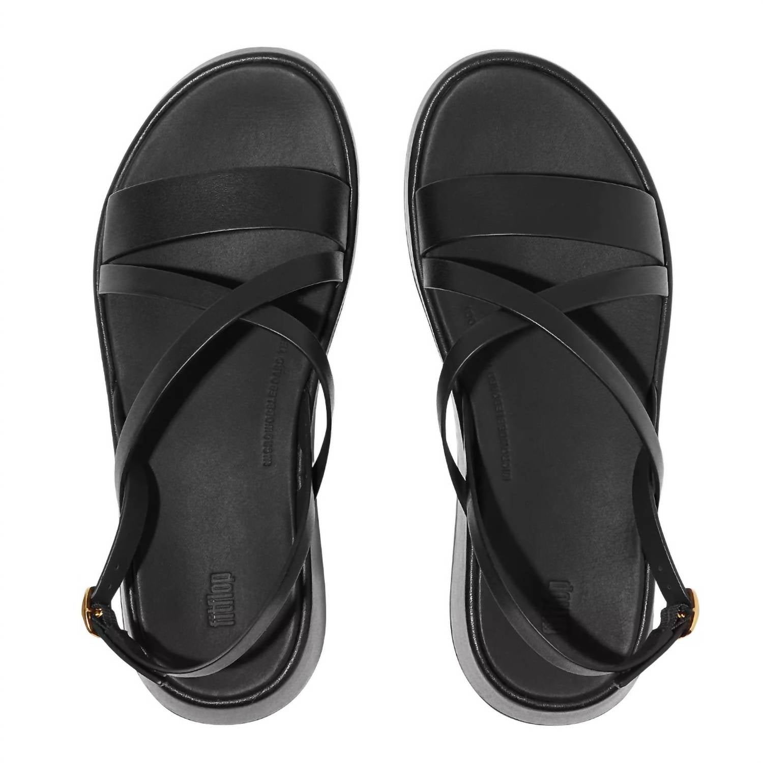 Flowy dresses, cropped pants, and even jumpsuits... this sandal works with them all! Meet the Women's F-mode Leather Strappy Back-strap Sandals by Fitflop, a minimalist's dream in all-black leather. These sandals boast slender luxe leather straps that gracefully wrap around the foot, with an adjustable back strap featuring a brushed-metal buckle made from 100% recycled zinc. Experience the ergonomic Microwobbleboardâ„¢ midsole providing triple-density cushioning and natural arch support on a wedge heel for low-profile elegance, perfect for summer dinner parties and New Year's Eve celebrations. Designed for average to slim fit with a grip suited for light trails, these sandals merge comfort with style effortlessly.