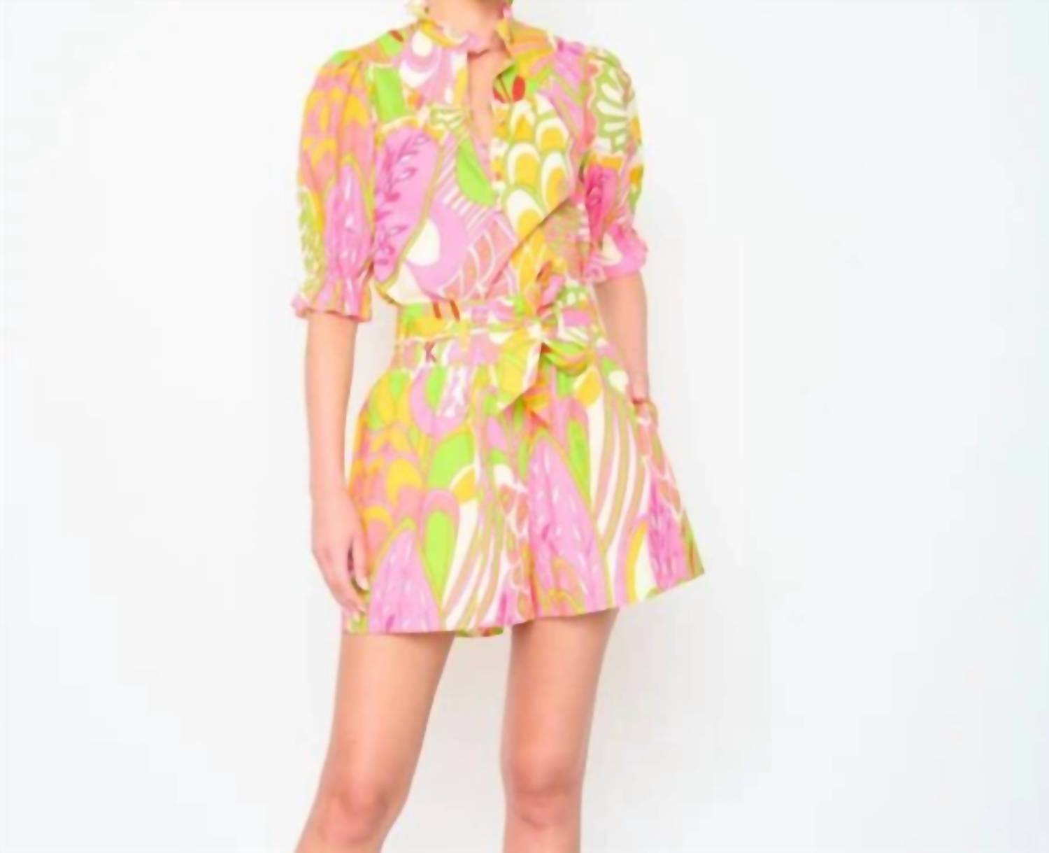 The perfect mini dress for those warmer months. The Adelina Mini Dress by Flora Bea is a chic addition to any spring wardrobe, featuring short sleeves with elastic for comfort and a mock neck with a ruffle detail. This A-line dress, designed with a vibrant South Beach floral pattern, is both feminine and stylish. The dress secures with a button closure, ensuring a seamless and elegant look. Care instructions: Machine wash, perfect for the modern woman looking to make a statement at any dinner party or Valentine's Day celebration.