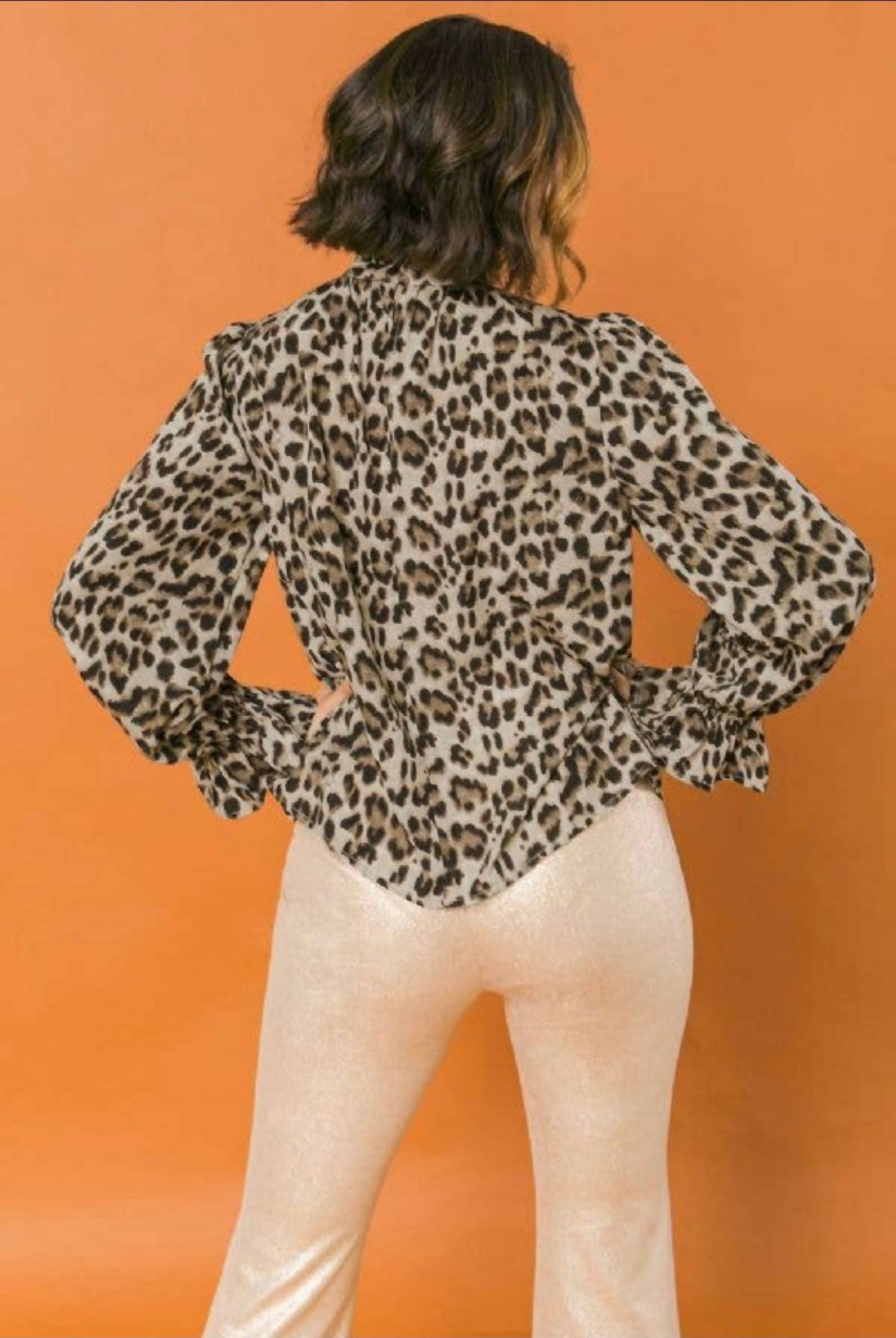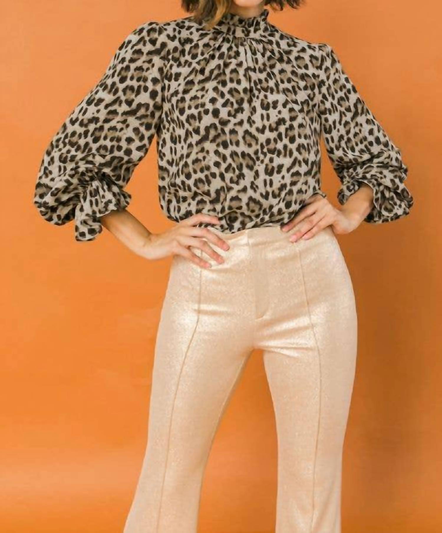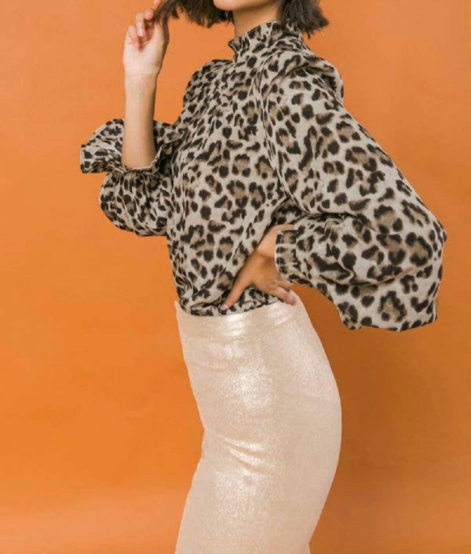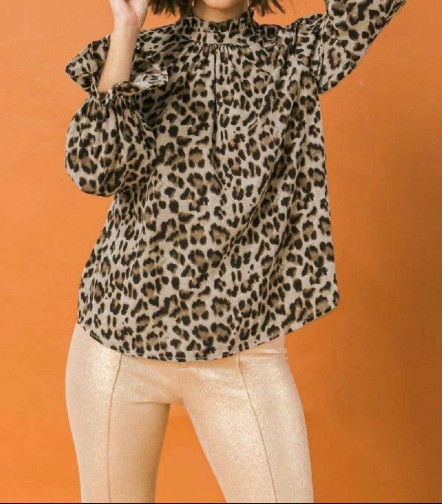 Pair this with your favorite jeans and slides for your next girls night out. Elevate your style with the Ready & Willing High Neck Top by FLYING TOMATO, featuring an eye-catching leopard print. This blouse showcases long sleeves with ruffled cuffs for a touch of elegance, crafted from 100% Polyester for a relaxed fit. The garment has an approximate length of 25 inches and is perfect for holiday parties. Care instruction: Dry clean only. Model is 5'8" and is wearing a size small.