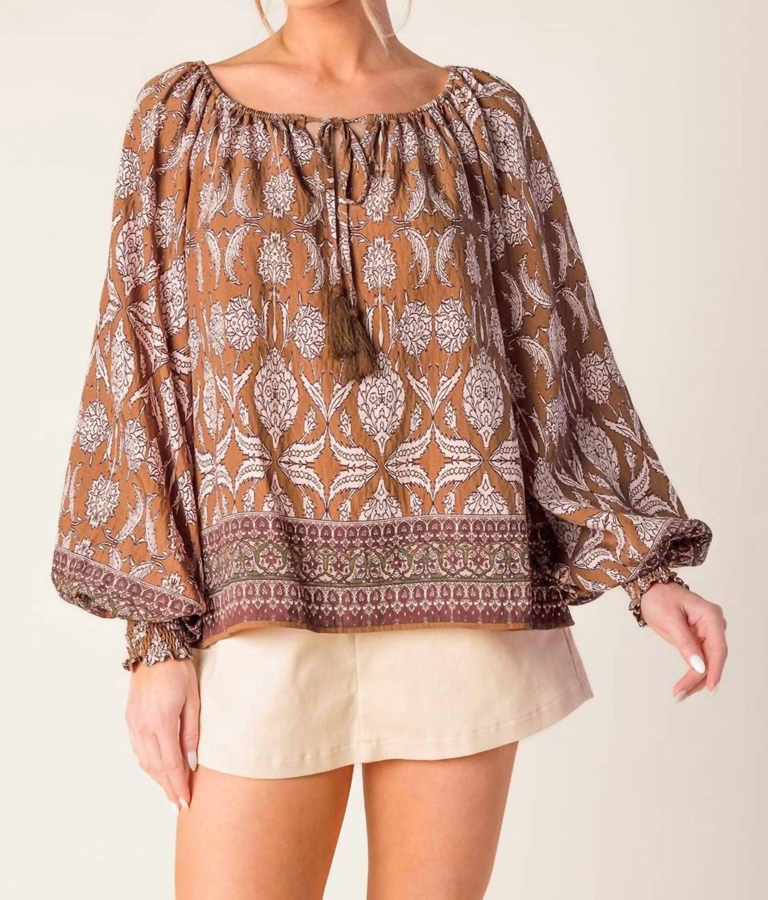 A timeless blouse that will never go out of style. Introduce vibrant flair to your wardrobe with the Rosa Abstract Print Drawstring Top by FLYING TOMATO, perfect for those seeking a maximalist statement. This blouse is adorned with captivating long blouson sleeves that end in smocked cuffs, adding a touch of elegance to its flowy silhouette. Made from a soft nylon blend composed of 85% rayon and 15% nylon, it's lightweight and breathable, ideal for a vacation or casual day out. Featuring a playful pull-on closure with a flattering drawstring neckline, this top offers comfort in styling, and it is easy to care for with hand wash and line dry instructions.