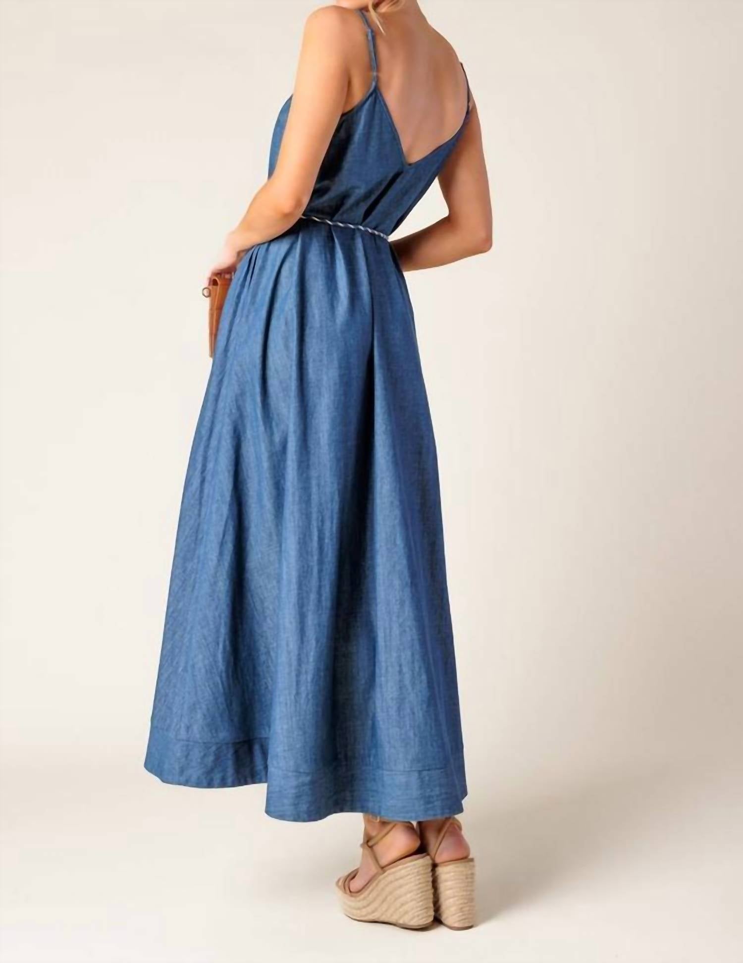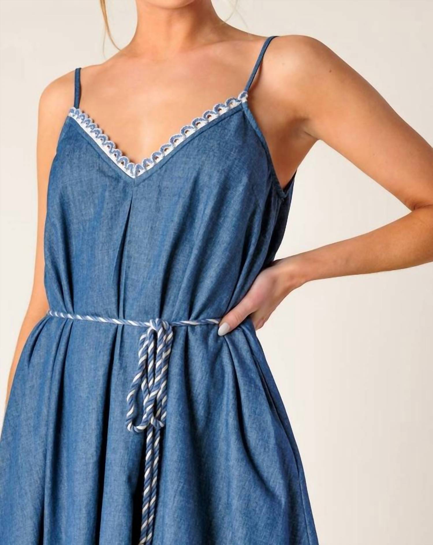 The perfect length dress does exist. Elevate your summer wardrobe with the FLYING TOMATO Washed Denim Midi Dress, crafted for those sun-soaked vacations. Featuring spaghetti straps and a vintage-inspired solid wash, this medium indigo dress hits at a flattering 55-inch length. Made from a blend of 85% cotton and 15% polyester, it boasts a V-neckline with a delicate lace edge and a practical rope belt for a defined silhouette. Closure is pull-on, and it is proudly designed in China, combining functionality with ease as it's machine washable.