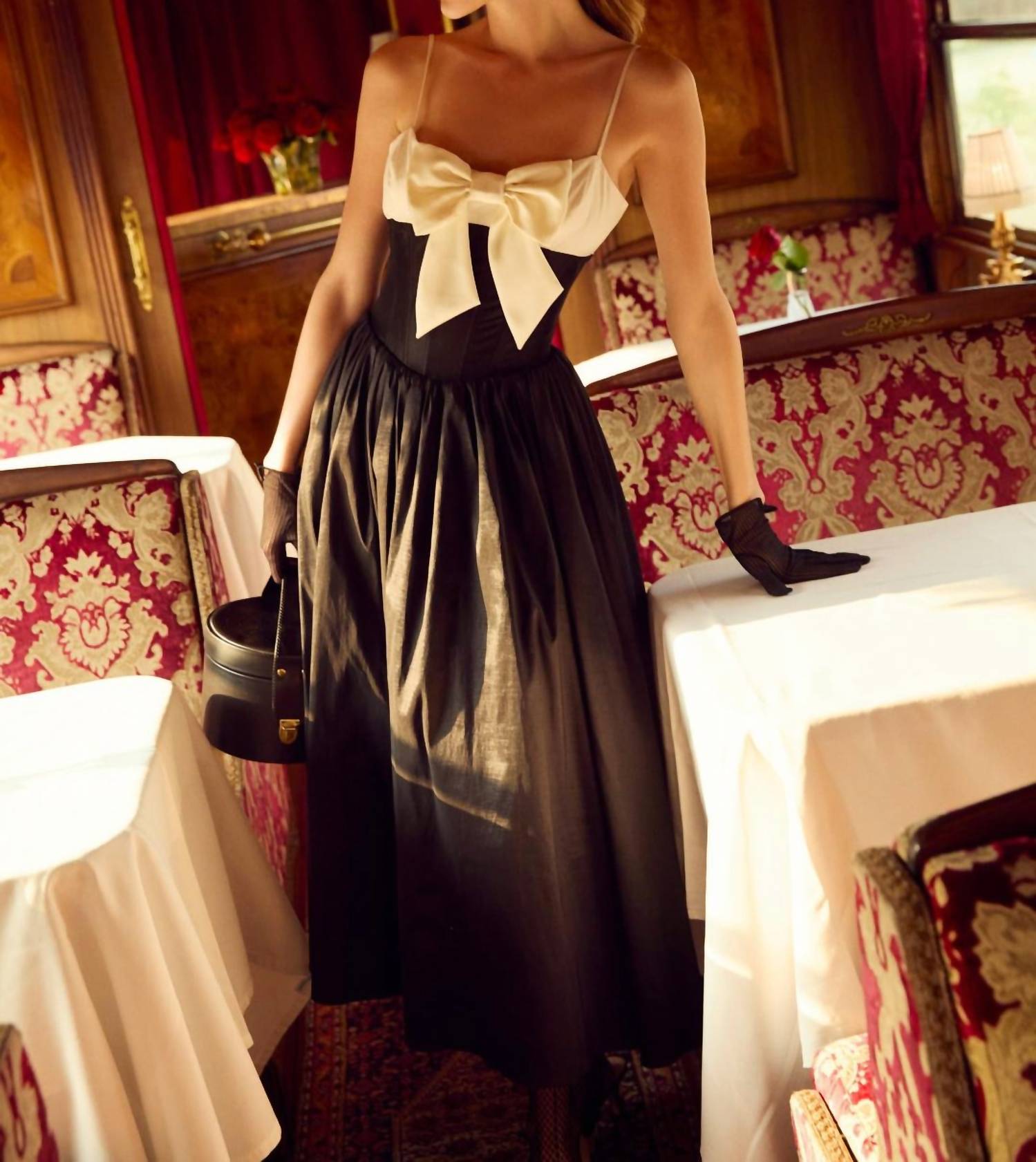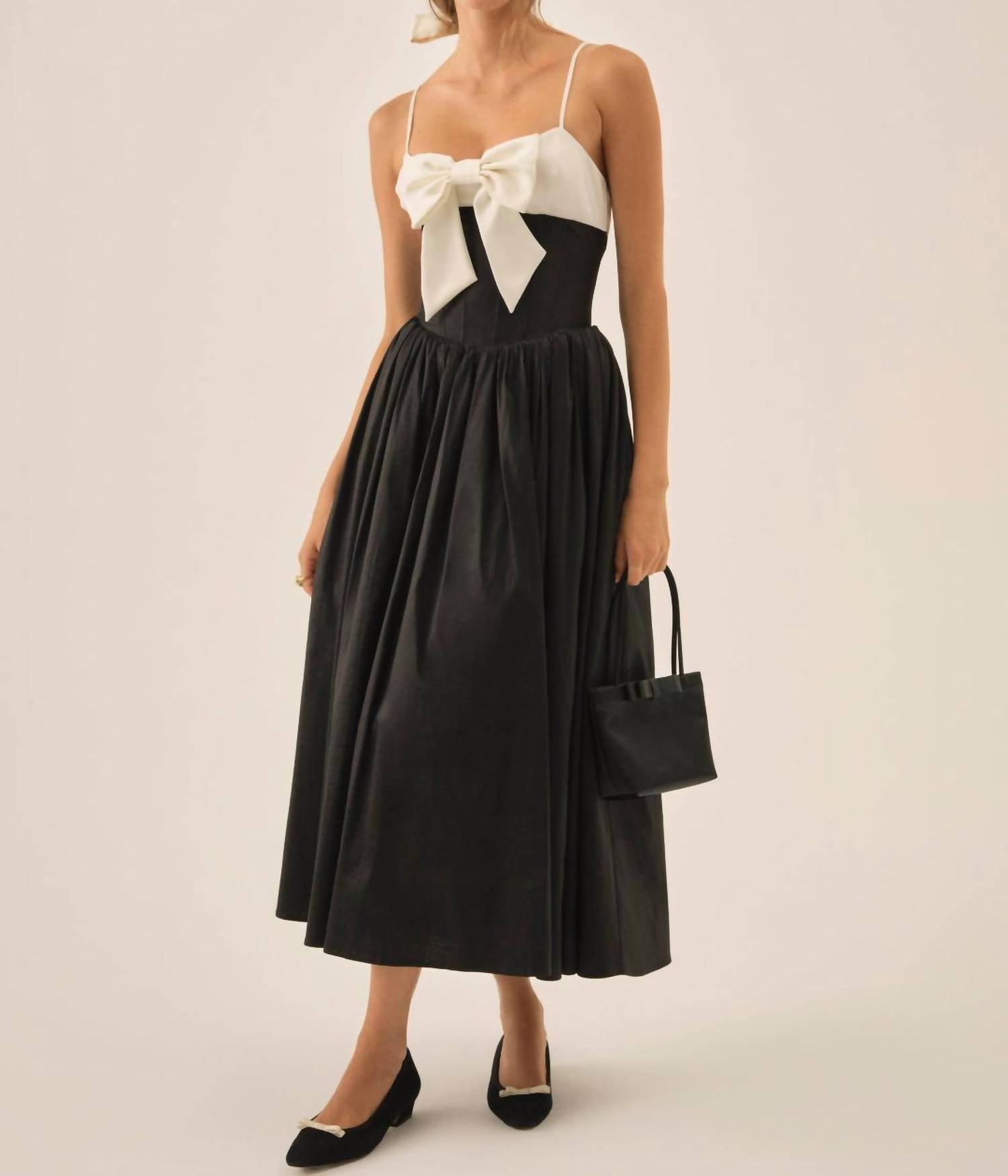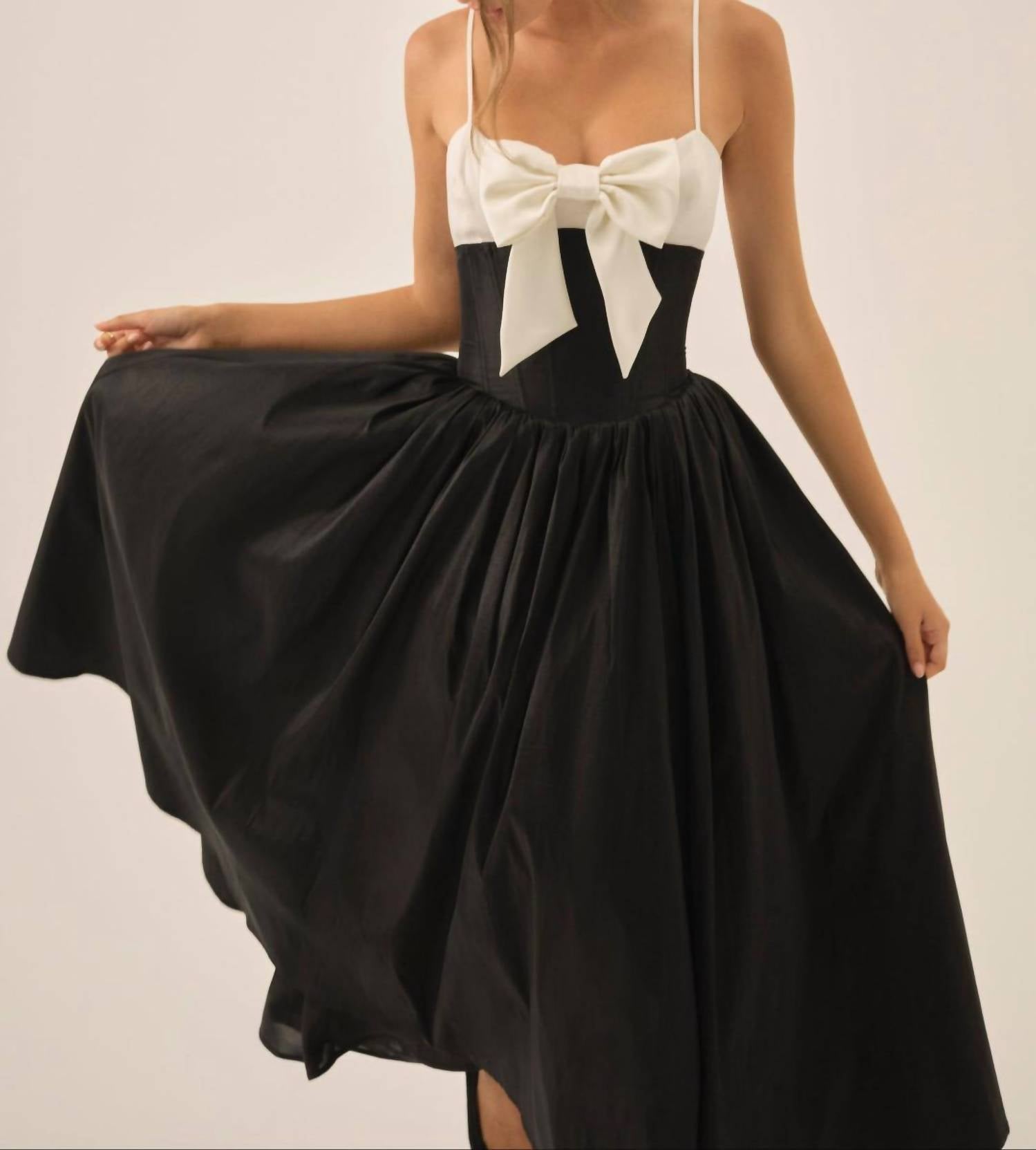 The perfect length dress does exist. Introducing the Emalie Taffeta Midi Dress by For Love & Lemons, perfect for embracing a vintage-inspired winter look. This A-line dress in black and white features elegant spaghetti straps and a sweetheart neckline. Crafted from 70% polyester, 24% nylon, and 6% spandex, with contrast and lining of 100% polyester and 98% recycled polyester respectively, it ensures both style and sustainability. To maintain its pristine appearance, this dress should be dry cleaned.