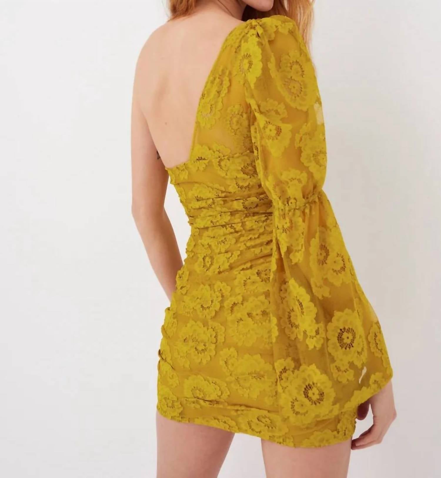 The kind of easy and flattering dress you'll be reaching for all season long. Discover the Tiana Lace Mini Dress by For Love & Lemons, an exquisite choice for any cocktail party. This maximalist, bodycon mini dress in vibrant yellow features a one-shoulder gathered bell sleeve design, with intricate bouquet lace and a sophisticated shirred skirt. Made with eco-conscious material, the dress consists of 100% nylon with a strapless lining made from 92% recycled polyester and 8% spandex, emphasizing sustainability. Closure: Invisible zip closure. Care: Eco dry clean advised, avoiding harmful chemicals.