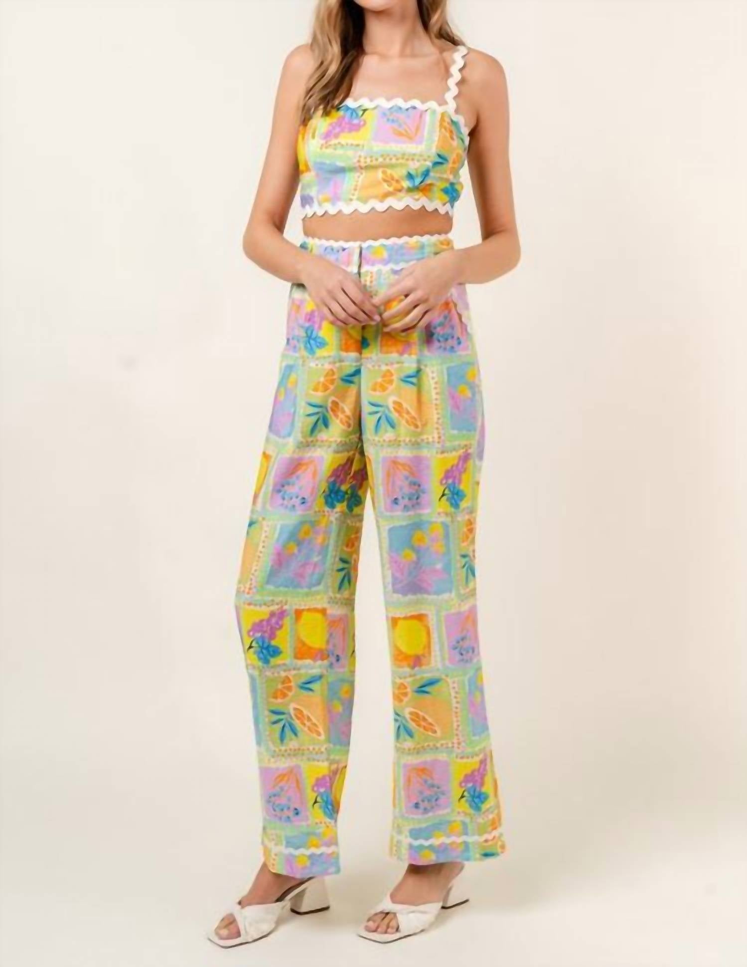 Introducing the Citrus Garden Pants by Fore Collection, designed to infuse your wardrobe with a burst of retro charm. These high-rise, wide-leg pants showcase a vibrant fruit color block pattern and wave contrast trim, creating a standout look. Crafted from 83% Rayon and 17% Nylon, they promise comfort with their relaxed fit. Closure: Hook and eye closure. Functional pockets ensure practicality without compromising on style. Perfect for summer vacations and boho chic vibes.