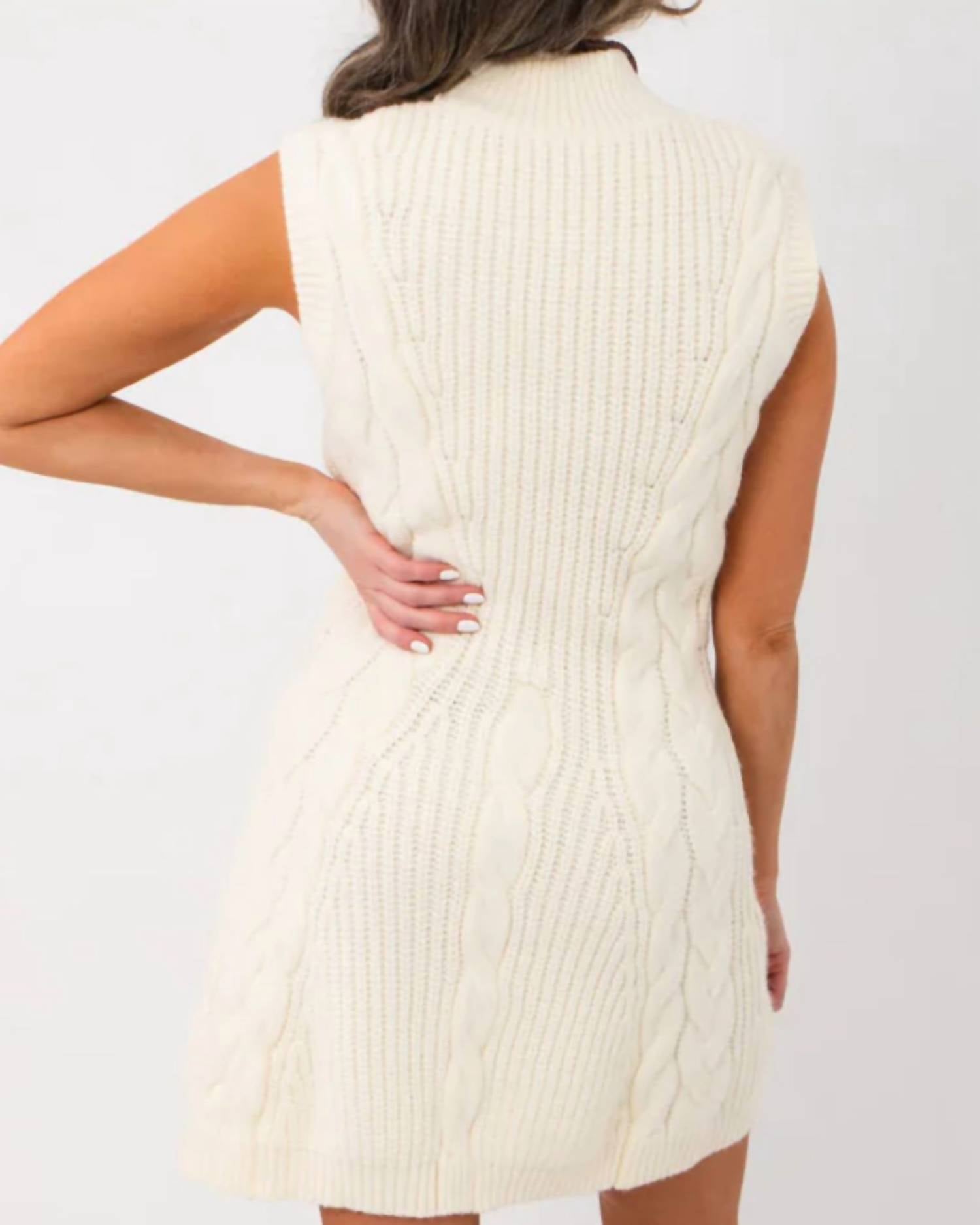 The kind of easy and flattering dress you'll be reaching for all season long. Presenting the sleek Fore Mock Neck Sleeveless Dress in classic white, a versatile addition to your winter wardrobe. Crafted from soft white cable knit material, this mini dress combines warmth with a stylish sleeveless design, ideal for layering. Originated without specifying the country, it features a convenient pull-on closure. Care instructions advise hand washing and laying flat to dry, ensuring longevity and continued sophistication.