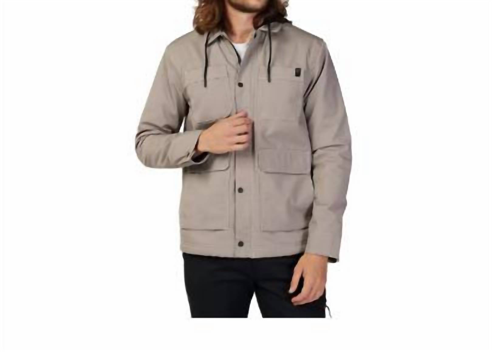 Introducing the Mercer Jacket by Fox Head Inc., the ultimate fall staple for effortless style and warmth. Designed in a solid taupe color, this men's jacket features long sleeves and a fleecy hood for added comfort. Crafted from durable canvas twill, it includes practical pockets and exudes easy charm for travel occasions. Season: Fall. Ideal for layering over your favorite flannel as the weather cools. Care instructions are not specified.