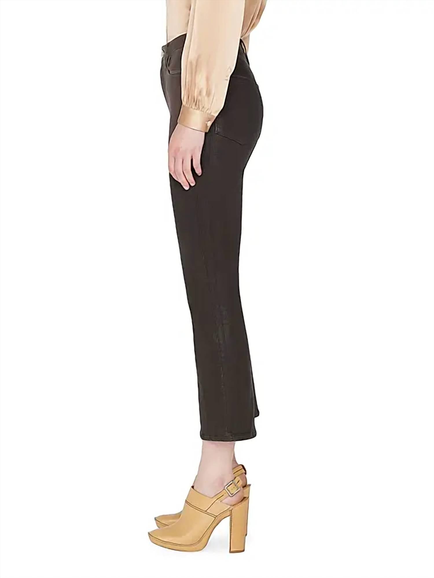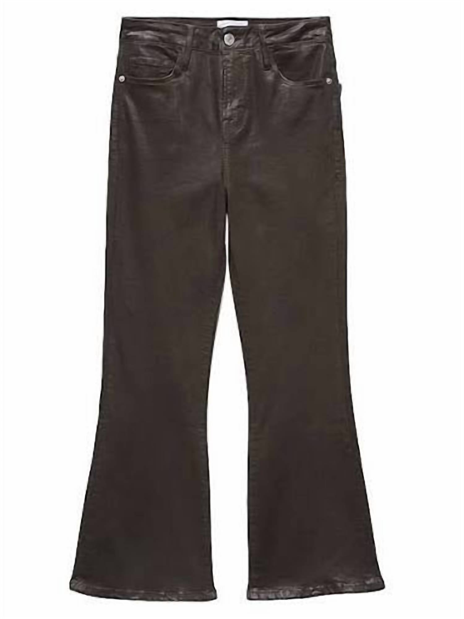 Comfortable and stylish, we love this cropped jean for all of the obvious reasons. Explore the sophisticated charm of FRAME's Le Crop Wax Flare Jeans, meticulously crafted in a rich Espresso Coated hue. These jeans boast a high-rise waist and relaxed fit with a flared leg style, perfect for vacation looks. Composed of 38% Lyocell, 32% Cotton, 20% Recycled Cotton, 5% Recycled Polyester, and 5% Elastane, they feature a stylish waxed finish and practical side slip and back patch pockets. Closure is ensured with a classic zip fly and button, while care instructions recommend dry cleaning.
