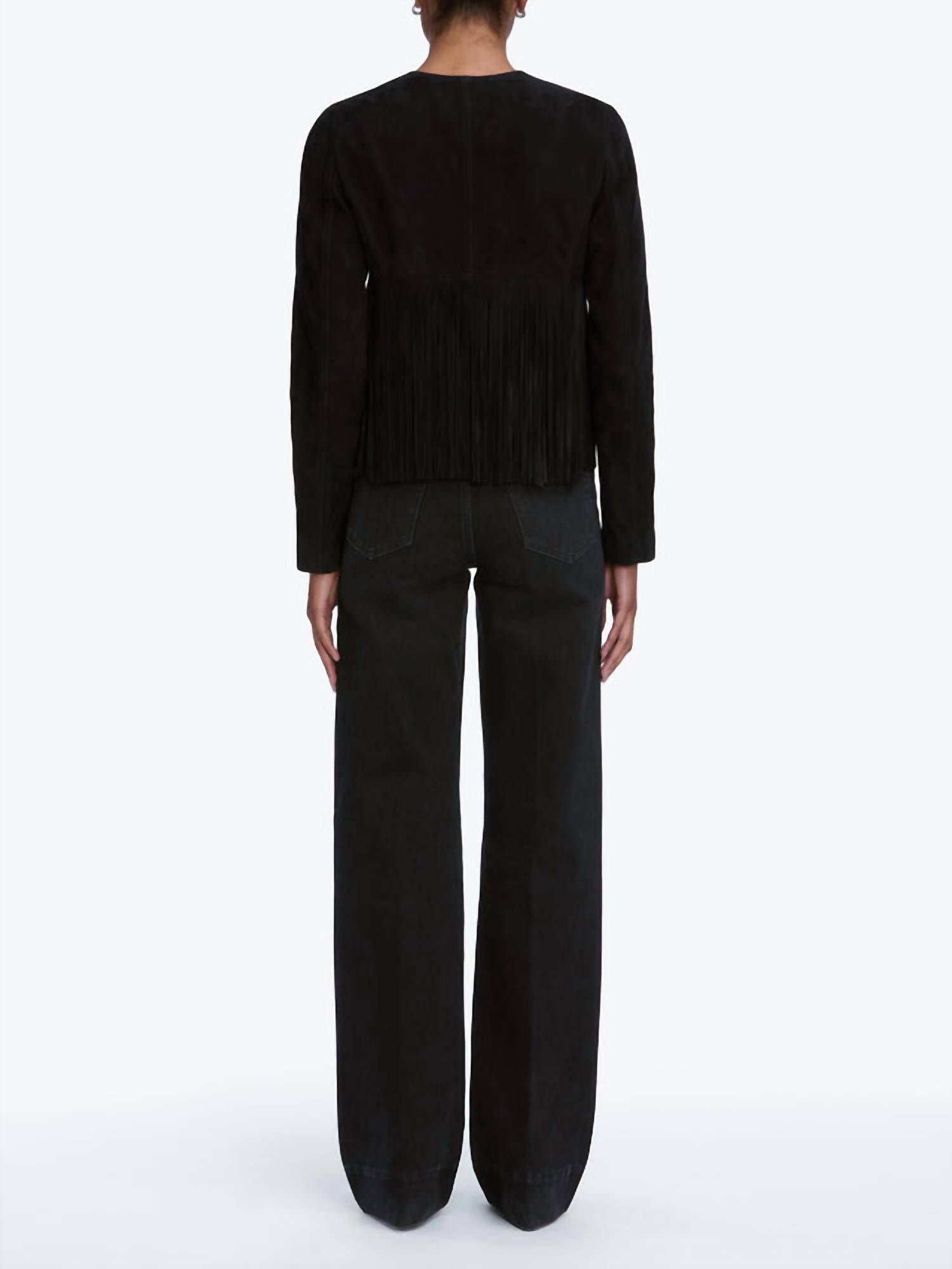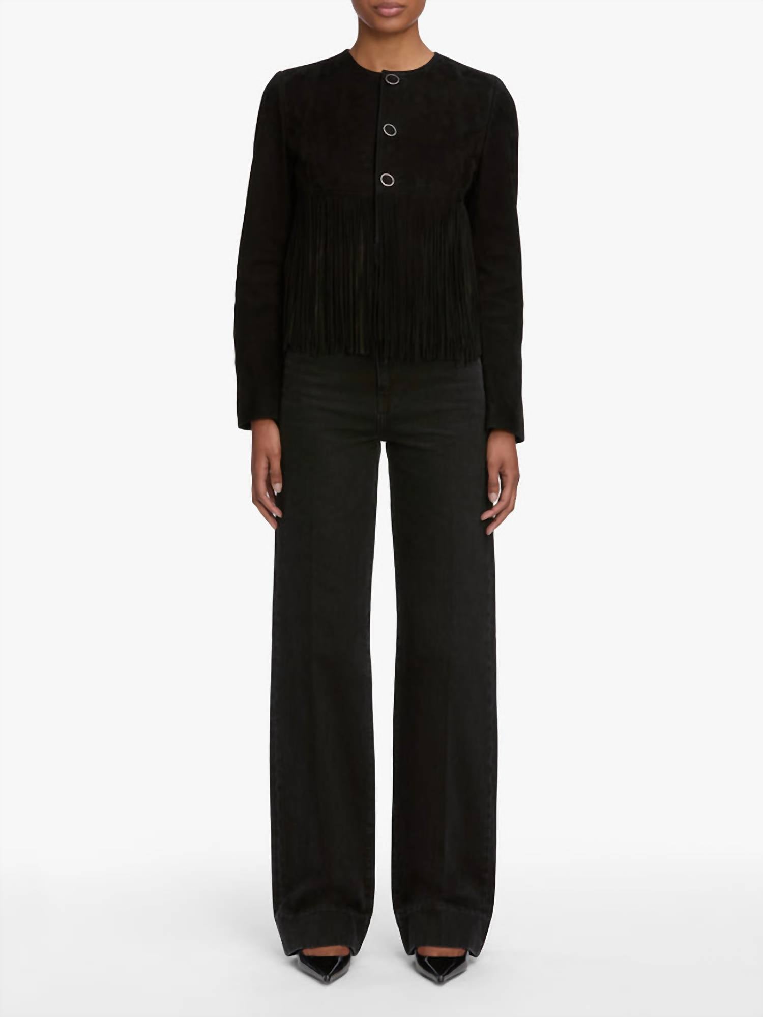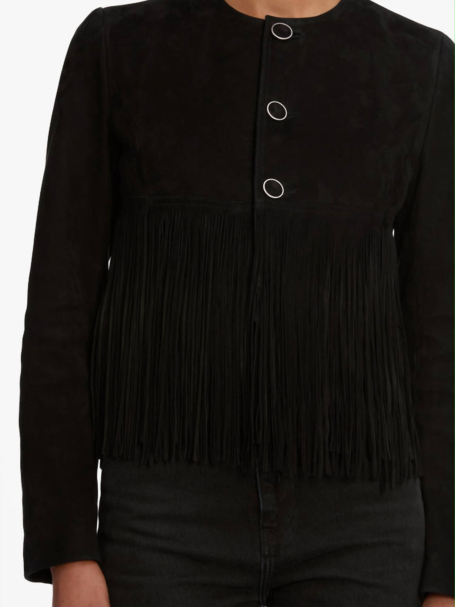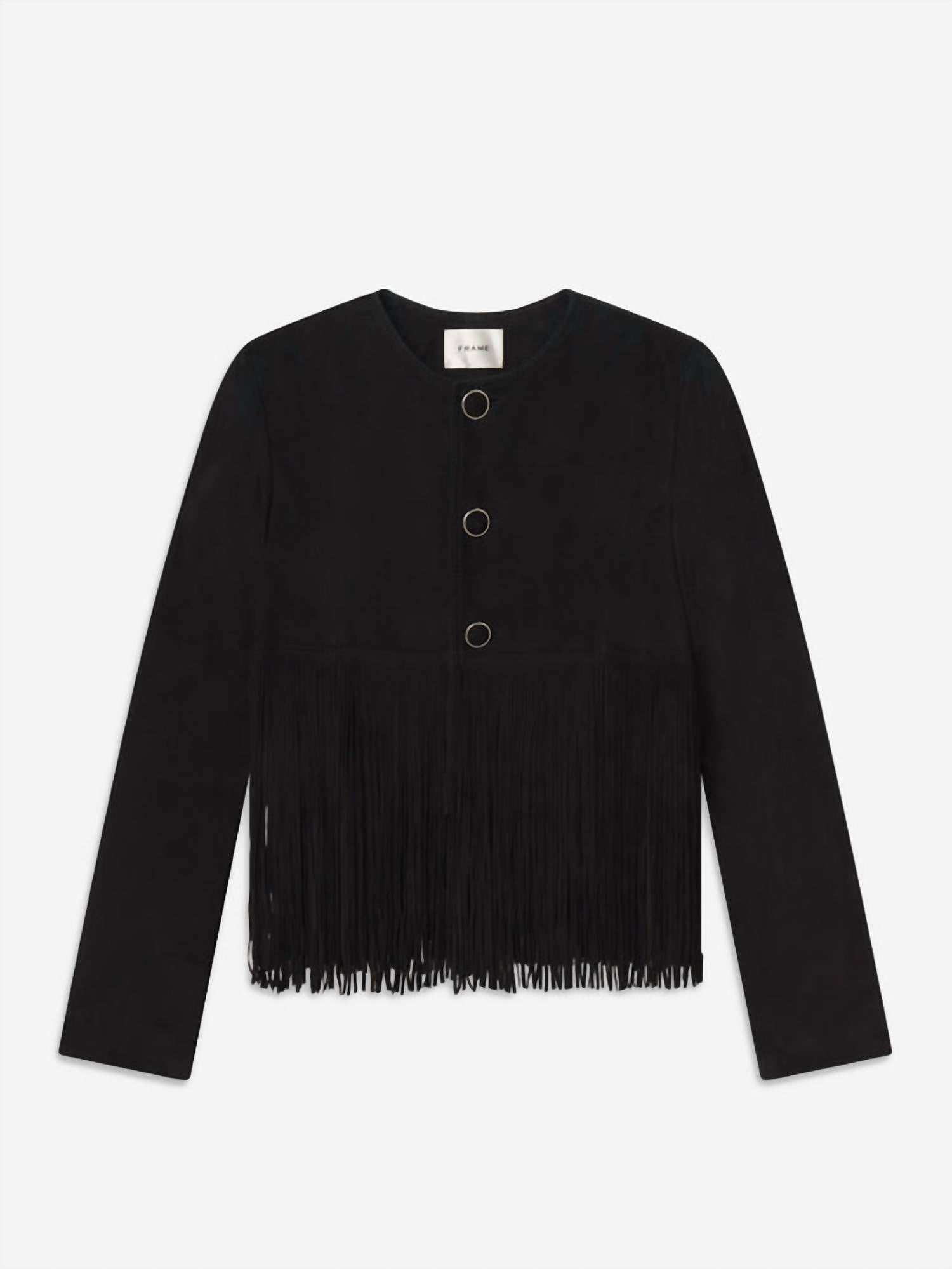Soft leather, impeccable design. This leather jacket is a win-win. Presenting the Saddle Jacket by FRAME, a statement piece perfect for any holiday party this fall. This women's jacket is crafted from 100% calf leather and features long sleeves with stacked, double-layered fringe accents. Measuring 17" in length from the shoulder, it offers a bold silhouette with Western-inspired button closure details. To maintain its luxurious appeal, it should be cleaned professionally by a leather and suede specialist.