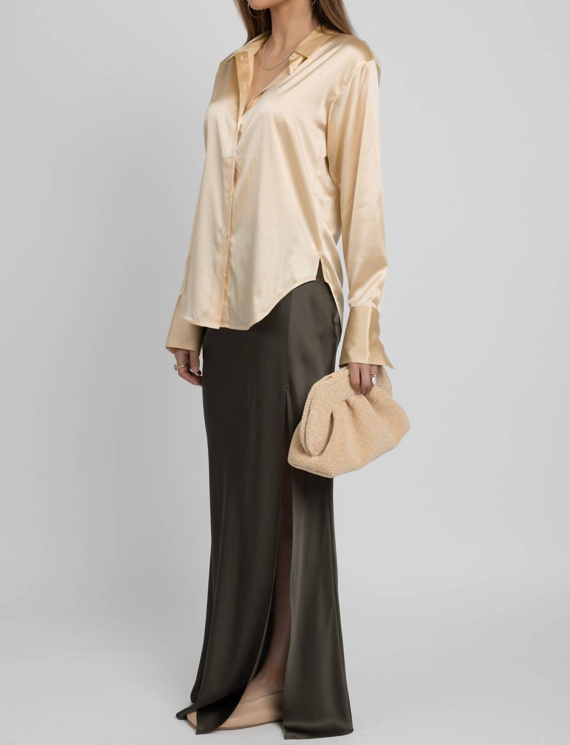 A classic button down shirt that will never go out of style. Embrace understated elegance with the Standard Silk Shirt in Butter by FRAME, perfect for any engagement occasion. Designed with long sleeves and button cuffs, this piece presents a timeless silhouette and relaxed fit with dropped shoulders and a pointed collar. Made from a sumptuous blend of silk and spandex, it features a front button closure and a chic shirt-tail hem. Imported and tailored for dry cleaning, this shirt is the embodiment of quiet luxury for the summer season.