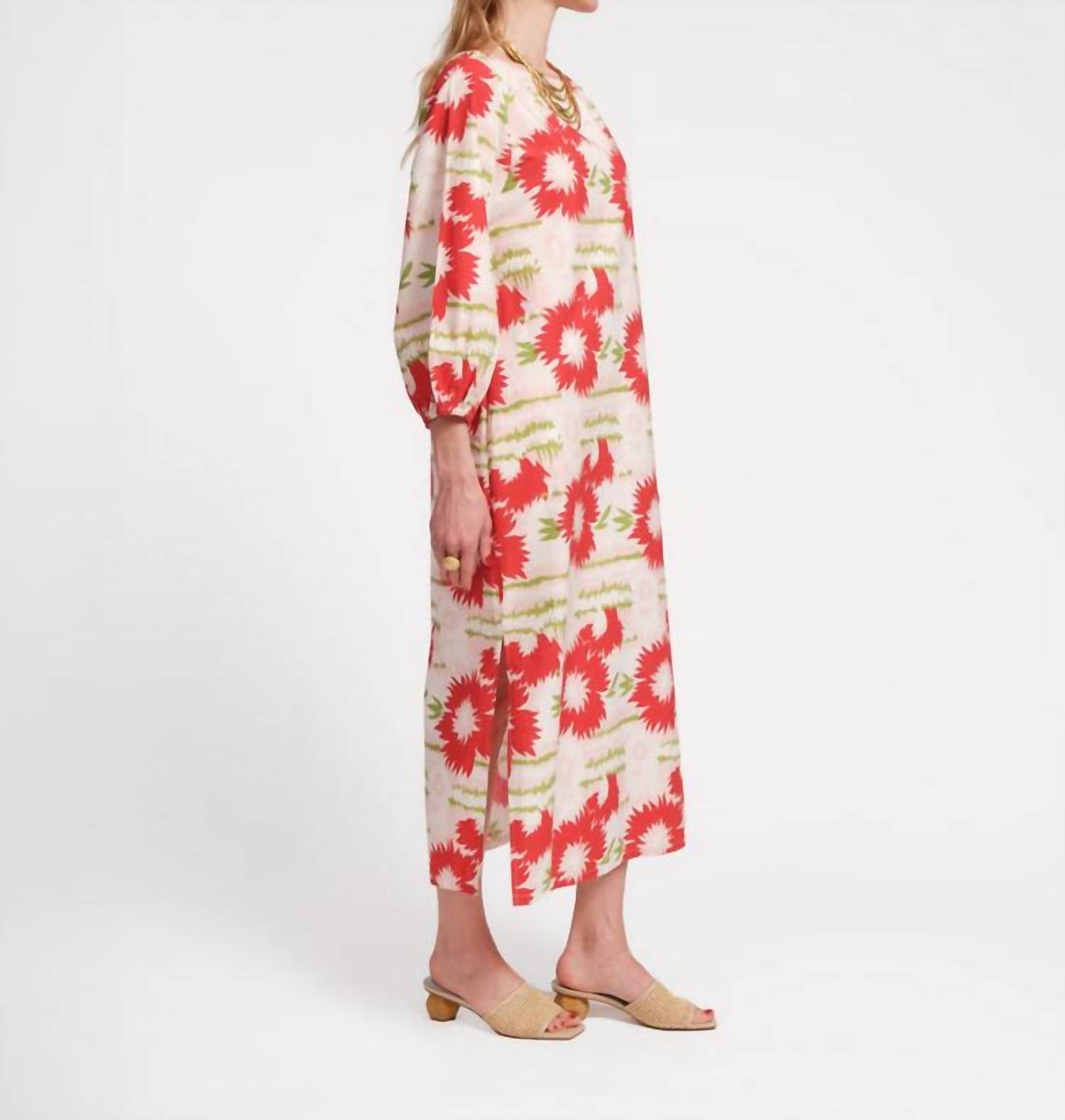 A maxi dress that is just as cute as it is comfortable. Elevate your holiday party wardrobe with the Minnow Maxi Dress by Frances Valentine, presented in a vibrant Dahlia Burst floral pattern. This shift silhouette boasts three-quarter puff sleeves with elastic hems and an elegant boatneck, crafted from soft, lightweight 100% cotton for comfort and style. Featuring a practical pull-on design without zippers or buttons, alongside side seam slits and two side pockets, it's made in India. Care instructions include hand washing, laying flat to dry, and warm ironing if needed, or opting for professional dry cleaning.