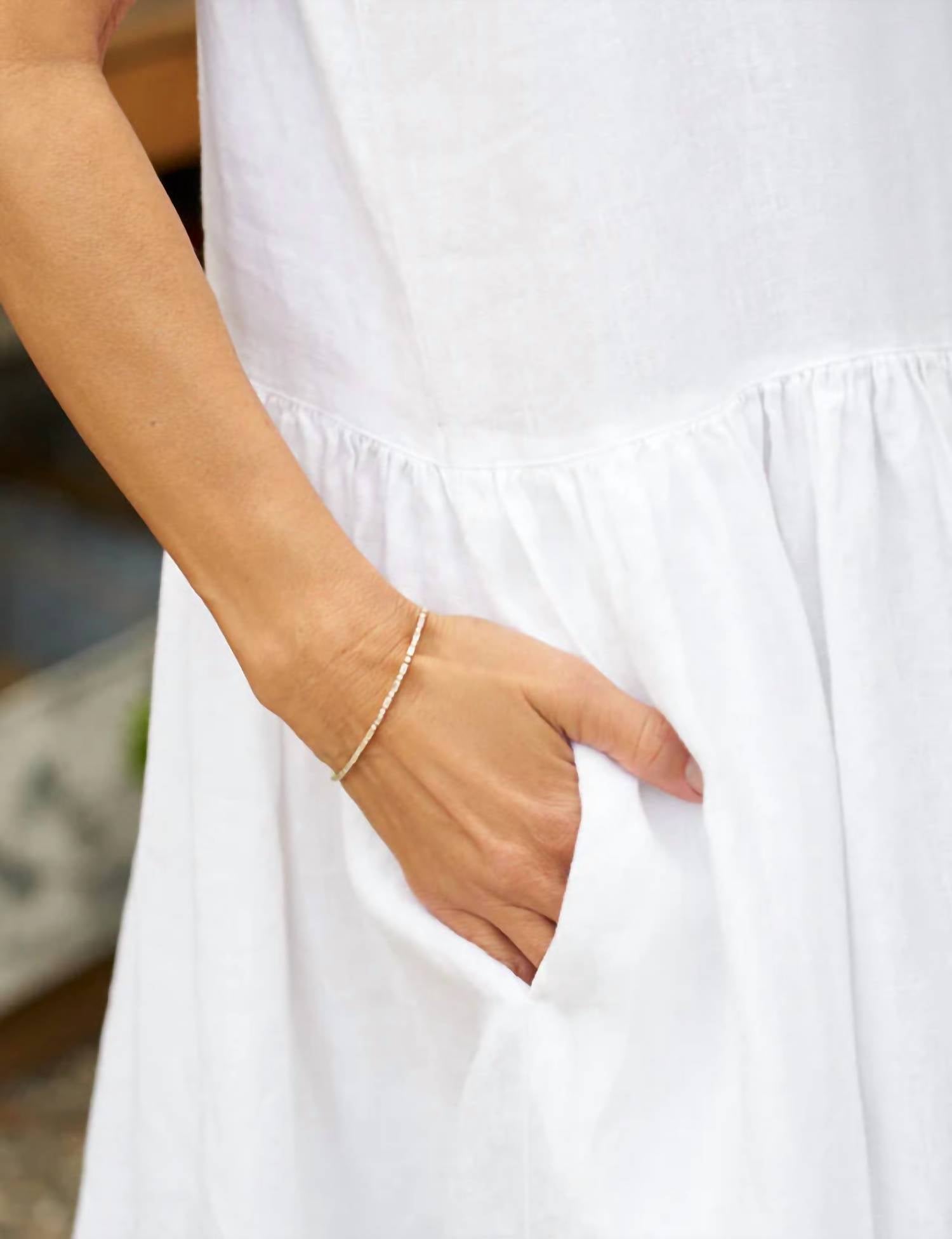 The perfect length dress does exist. Meet the Popover Sleeveless Shirtdress by Frank & Eileen, a chic and versatile maxi dress perfect for any occasion. This dress, made from 100% washed linen, offers a luxurious feel and a beautifully draped silhouette, reaching 49 inches from shoulder to hem. Designed in Mauritius, it features a collared V neckline with handy side pockets and a sleeveless pullover style without closure. For easy care, machine wash on cold and tumble dry on low. Model Simone is 5'8" with a 34" bust, wearing a size S.