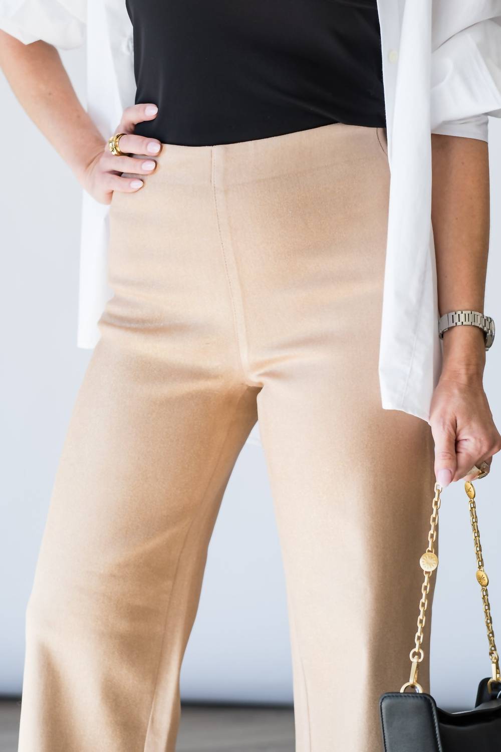 A perfectly tailored straight leg that you'll want in every color! Upgrade your wardrobe with the Westport Illusion Pant by Frank & Eileen, a chic option for your next special occasion. These pants feature a high-rise, straight-leg silhouette that flatters with a Champagne Glitter finish. Designed for women, they offer a sleek pull-on closure for ease and convenience. Embrace a touch of sparkle with these pants that perfectly blend sophistication and comfort.