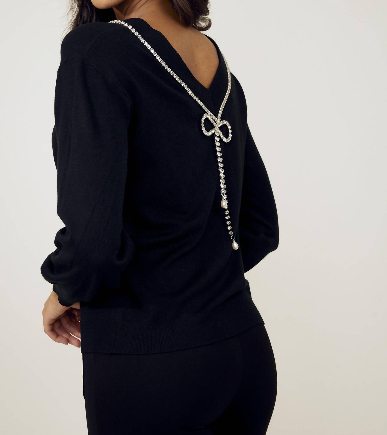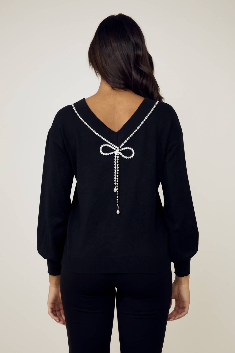 A timeless v-neck sweater that works season after season. Introducing the V-neck Jewel Embellished Sweater by Frank Lyman, a stunning piece designed to elevate your look. The hip-length sweater, made from 100% polyester, features long, puff sleeves and is adorned with stunning jewel embellishments and a sophisticated back bow. This pull-on style ensures easy wear, complementing the open back with a hint of elegance. Care: Hand wash, lay flat to dry. Approximate length for size 12 is 28" (71 cm).