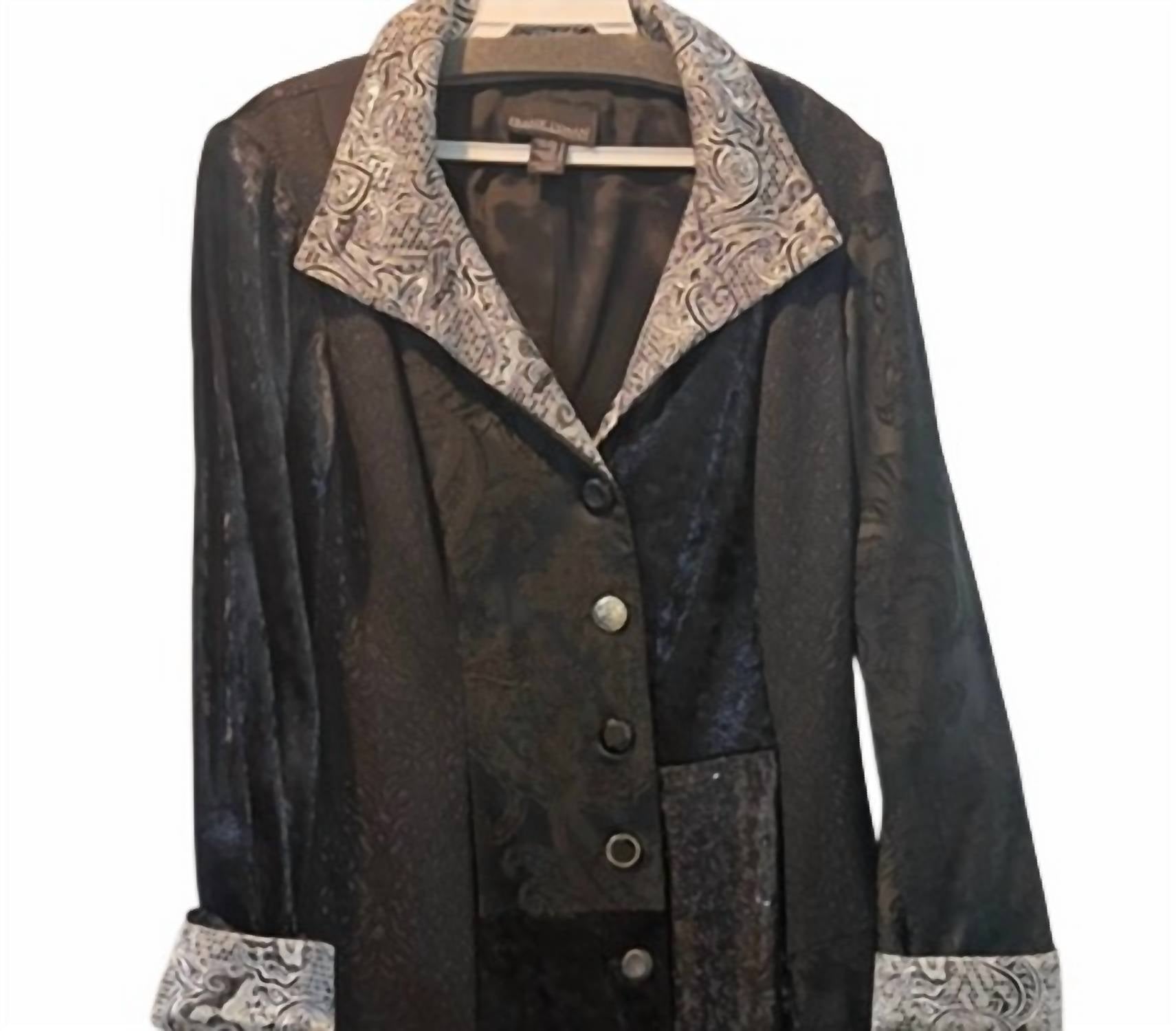 A blazer so versatile you can wear it to the office or pair it with jeans for a more casual look. Elevate your travel wardrobe with the Women's Jacquard Jacket by Frank Lyman, a chic choice featuring a striking black and silver floral pattern. With its long sleeves and a practical button closure, this blazer is perfect for the winter season and boasts a vintage trend appeal. The jacket is thoughtfully lined and includes pockets for added convenience. This women's jacket is ideal for travel, combining style and functionality seamlessly.