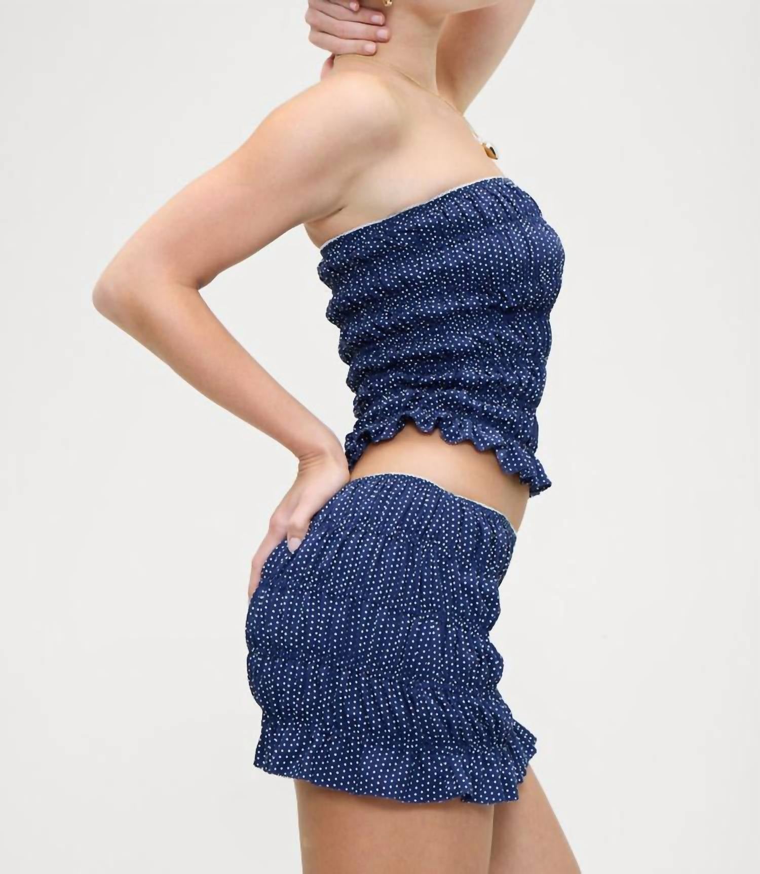 Experience the timeless charm of the Jolie Crepe Skirt by Frankies Bikinis, crafted for women who love a playful touch. This mini skirt, in a delightful Dotty polka dot pattern, is made from 100% lightweight polyester crepe fabric and features an 11-inch garment length. Designed with an elastic waistband and accented with a center bow detail, it's perfect for a touch of femininity. Its pull-on style is complemented by dainty trim and gathered fabric, making it easy to style and versatile. Made from imported poplin textile, hand wash is recommended for care.