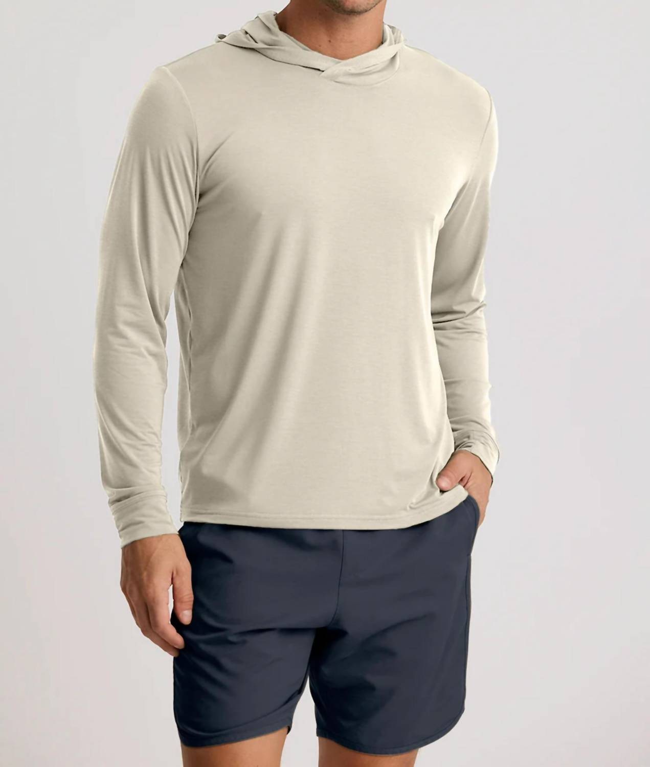 Introducing the Free Fly Elevate Lightweight Long Sleeve Hoodie, crafted for the modern traveler in a heather birch hue. This men's solid pattern hoodie features long sleeves with thumbholes and a hooded neckline for ultimate comfort. Made from a durable yet ultra-lightweight blend of 81% Polyester, 11% Lyocell, and 8% Spandex, it offers UPF 25 sun protection and drirelease® technology for quick drying and moisture-wicking. This pull-on sweatshirt requires hand washing and line drying to maintain its minimalist appeal while keeping you fresh with HeiQ® Fresh odor control.