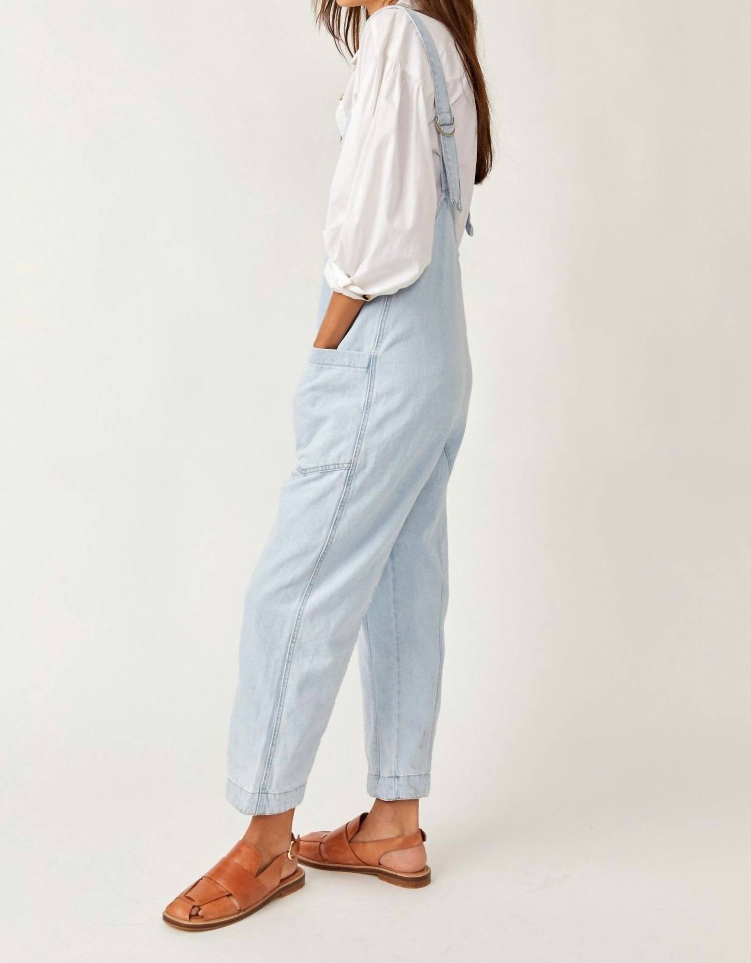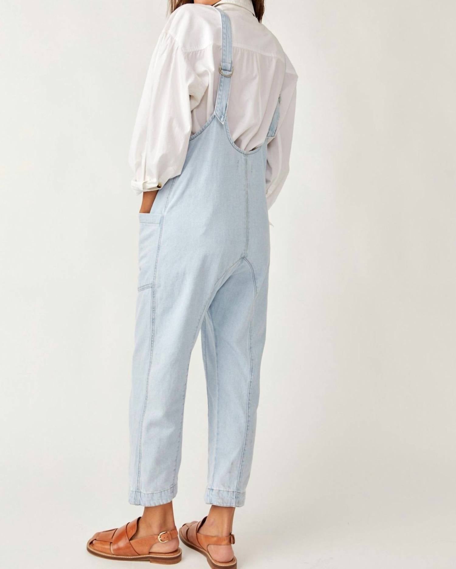 It doesn't take much for this one piece to look effortlessly cool. Add some statement jewelry to dress it up, or throw on some sneakers for a more casual vibe. Meet the High Roller Jumpsuit by Free People, a must-have from the We The Free Collection. This whimsical denim piece showcases a relaxed fit in cotton with an ankle-length cropped style, featuring harem legs and a low scoop neckline. Closure: Pull-on style. Care: Machine wash cold, tumble dry. Designed in a streetwear trend with practical oversized patch pockets, it's perfect for holiday parties or a casual summer day out. Measurements for size small include a 38-inch bust, 23.62-inch rise, 45.5-inch hips, and a 25-inch inseam.