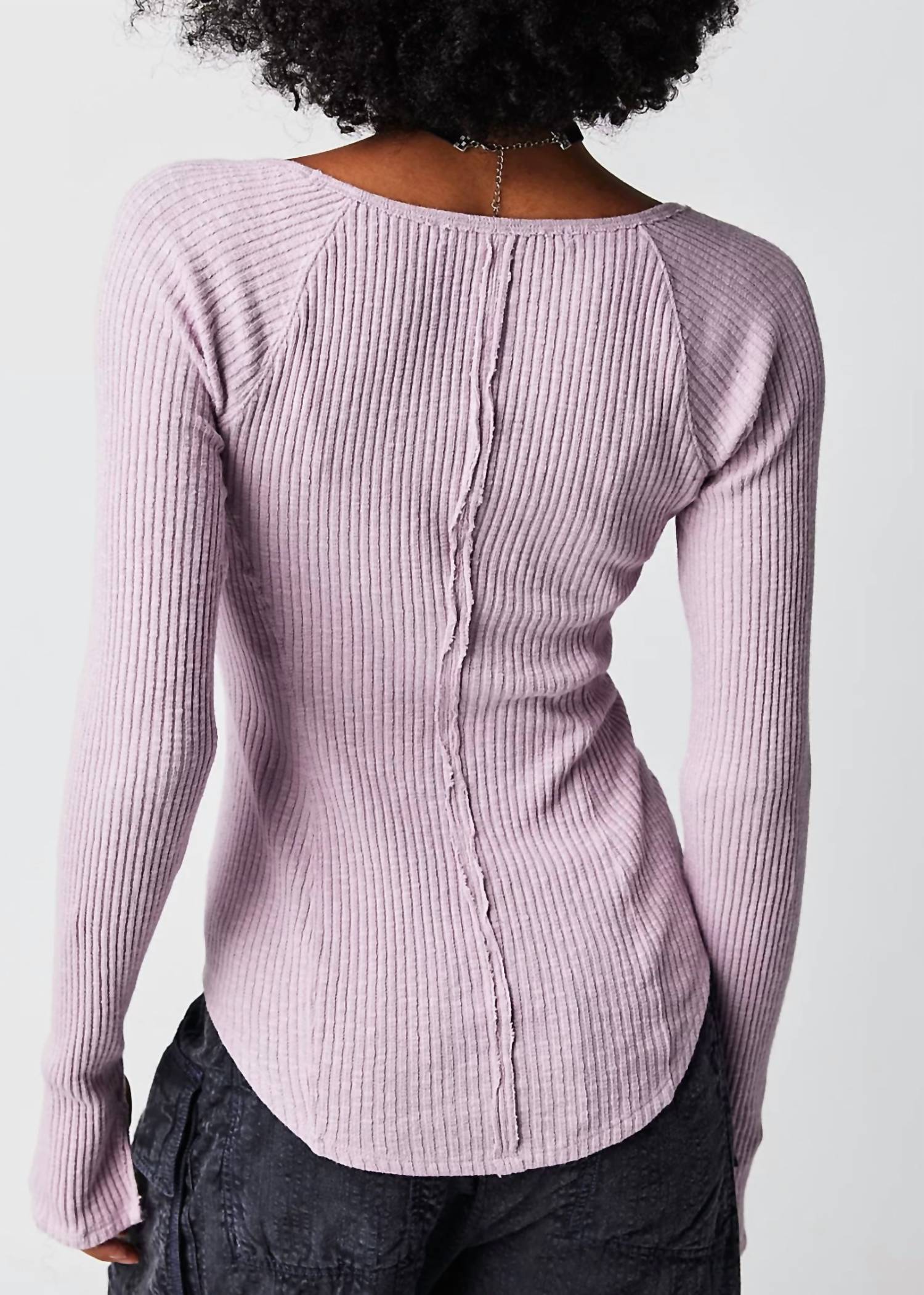 The perfect long sleeve tee that goes with just about anything. Discover the Passing Thru Layering Tee by Free People, a staple for any minimalist wardrobe. This women's lilac top features a fitted V-neck silhouette with long sleeves, ribbed knit fabrication, and slits at the sleeve cuffs for added flair. Designed for travel and spring occasions, it measures 24" in length, with a bust of 12.25" and sleeve length of 28.25". Composed for easy care, simply machine wash cold and line dry.