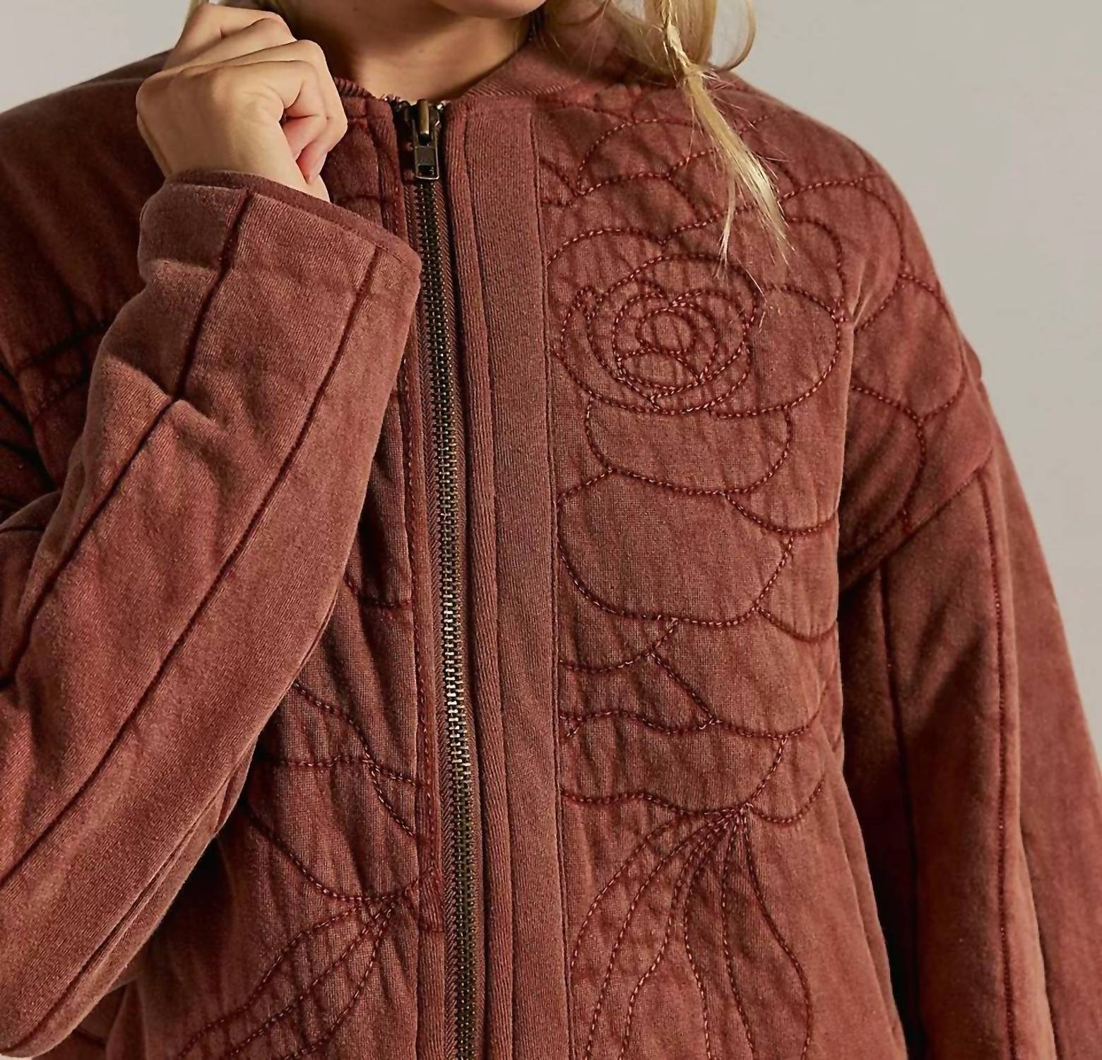 Cozy fabric, impeccable design - Meet the sweatshirt that you'll never want to take off. Embrace the elegance of the Rose Zip-up Sweatshirt by Free People, a stylish addition to your fall wardrobe. This cinnamon stick-colored sweatshirt boasts long sleeves, crafted from 100% cotton, ensuring comfort with every wear. Featuring a zip closure, banded collar, and side pockets, this textured garment offers functionality and fashion in a bomber-inspired silhouette with a delicate rose-embroidered bodice. Care is simple with machine wash cold instructions, making it a maintenance-friendly choice for those busy days.