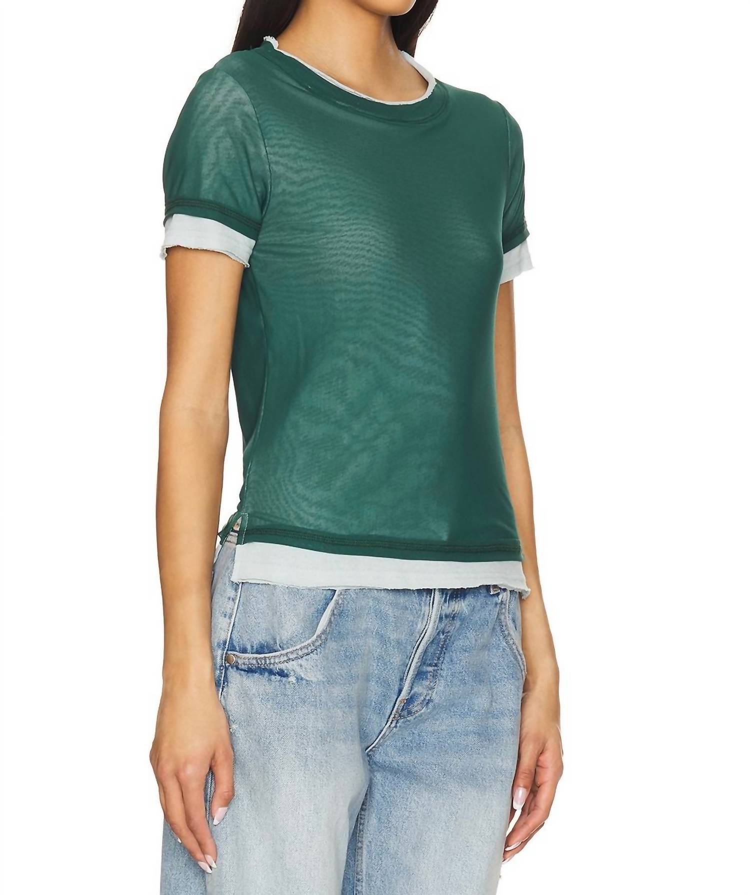 The short sleeve tee you'll want in every color. Introducing the Tasha Tee by Free People, a stunning piece in the color Icy Lake designed for chic, layered styling. This women's short sleeve tee is crafted from a midweight mesh fabric, featuring a nylon blend outer composition of 95% nylon and 5% elastane, and a 100% cotton inner lining. This pull-on style is made in Vietnam and showcases an exposed trim design for added flair. To maintain its quality, hand washing is recommended.