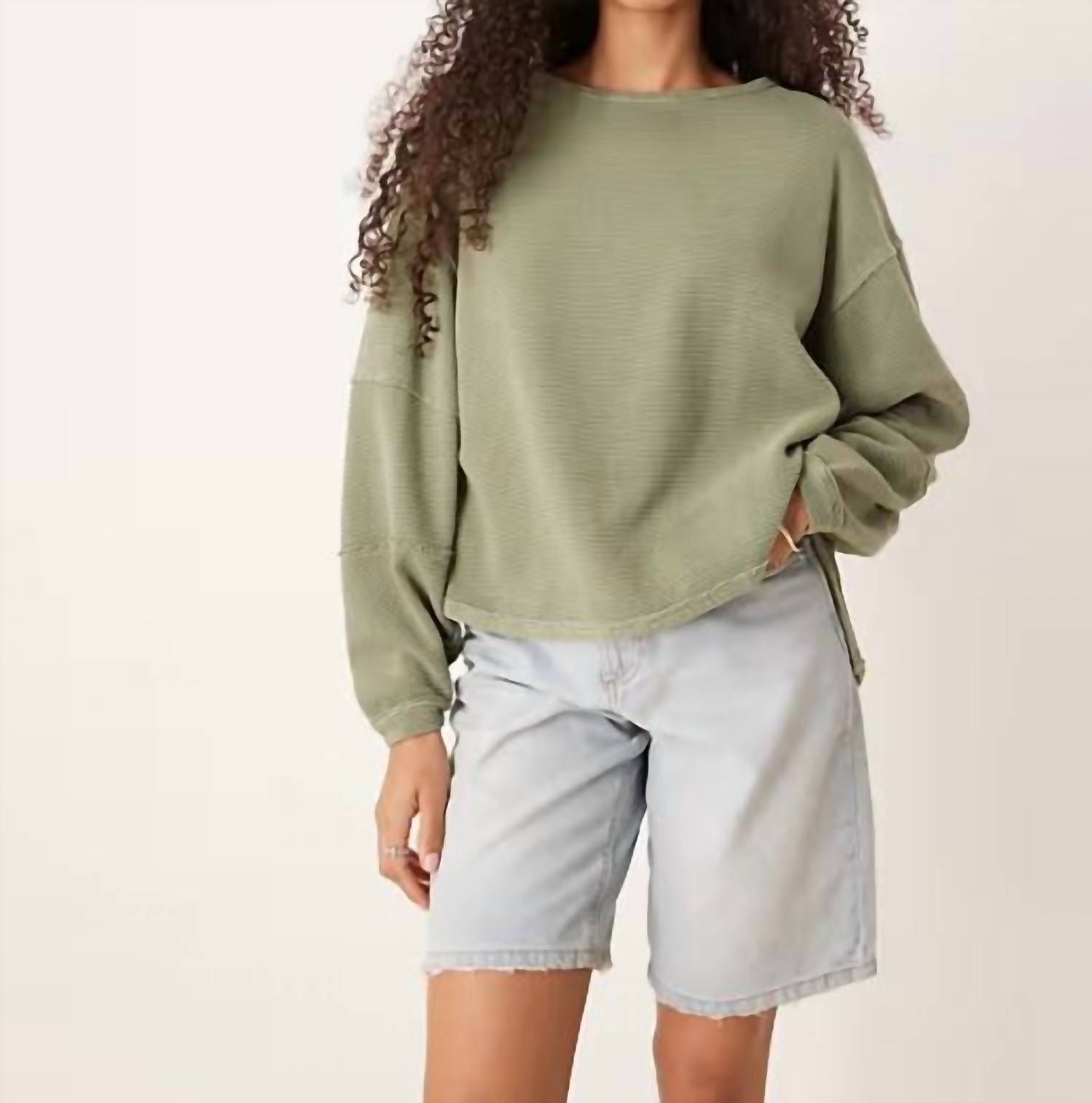 A long sleeve top you can wear with denim, skirts, well... just about anything! Elevate your casual wardrobe with the Free People Total Eclipse Tee in an eye-catching oil green. This long-sleeve tee is crafted from 100% ribbed cotton, providing a soft and breathable texture that's perfect for layering or wearing alone. Designed with a slouchy, oversized fit and drop-shoulder sleeves, it features cuffed hems and subtle raw-seam detailing for a relaxed silhouette. Care: Machine wash cold with like colors, tumble dry low, and low iron as needed.
