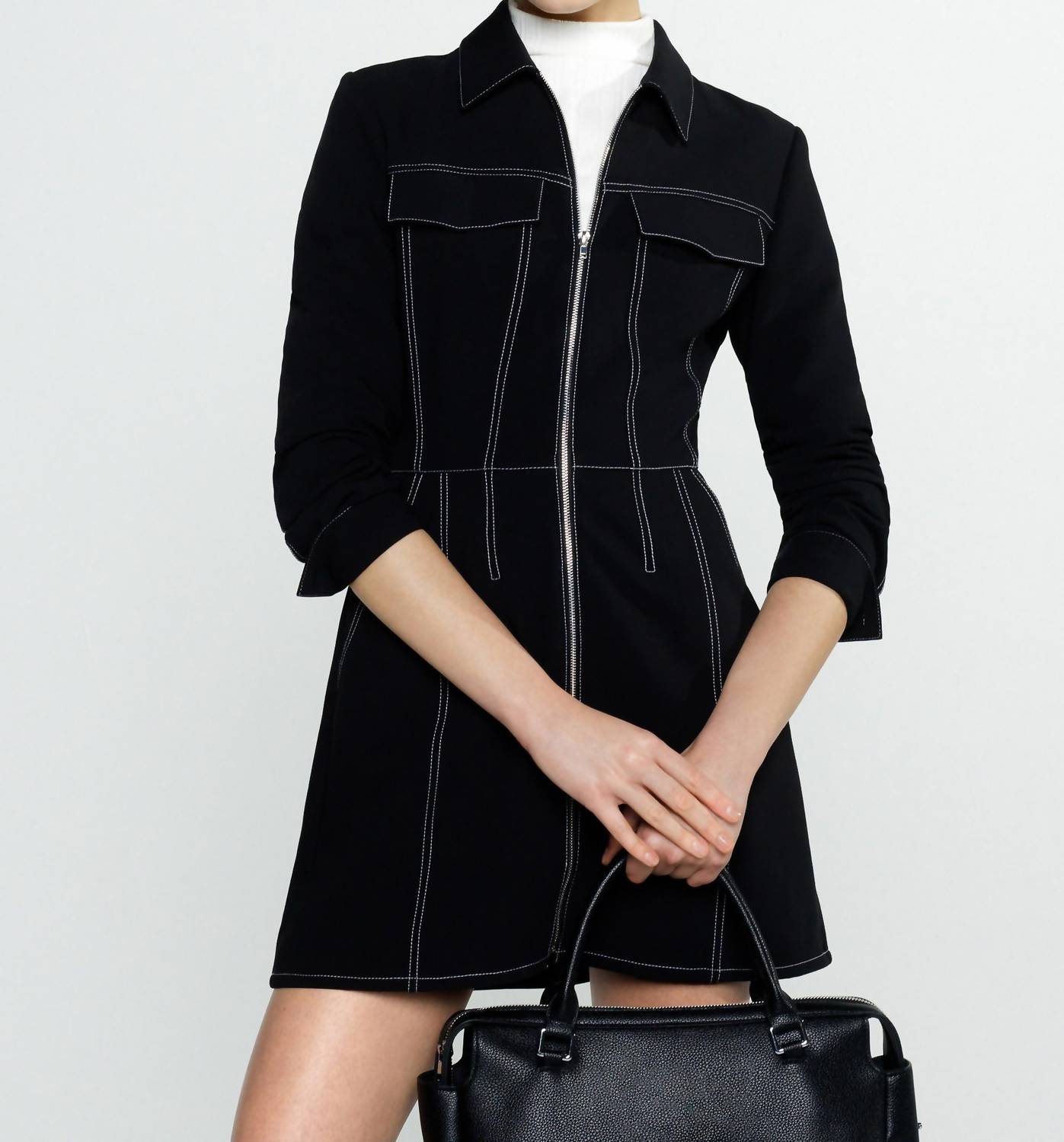 A short and breezy dress for those warmer days. Elevate your summer wardrobe with the Azra Twill Mini Dress by French Connection, a perfect choice for cocktail parties or workwear. It features a sleek sheath silhouette with a collar neckline and long sleeves, providing a chic and polished look. Crafted from a comfortable blend of 72% Polyester, 23% Viscose, and 5% Elastane, it offers convenience with zip closure and handy pockets. Care for this solid black mini dress by machine washing and line drying, and enjoy its stylish appeal for your next 4th of July holiday.