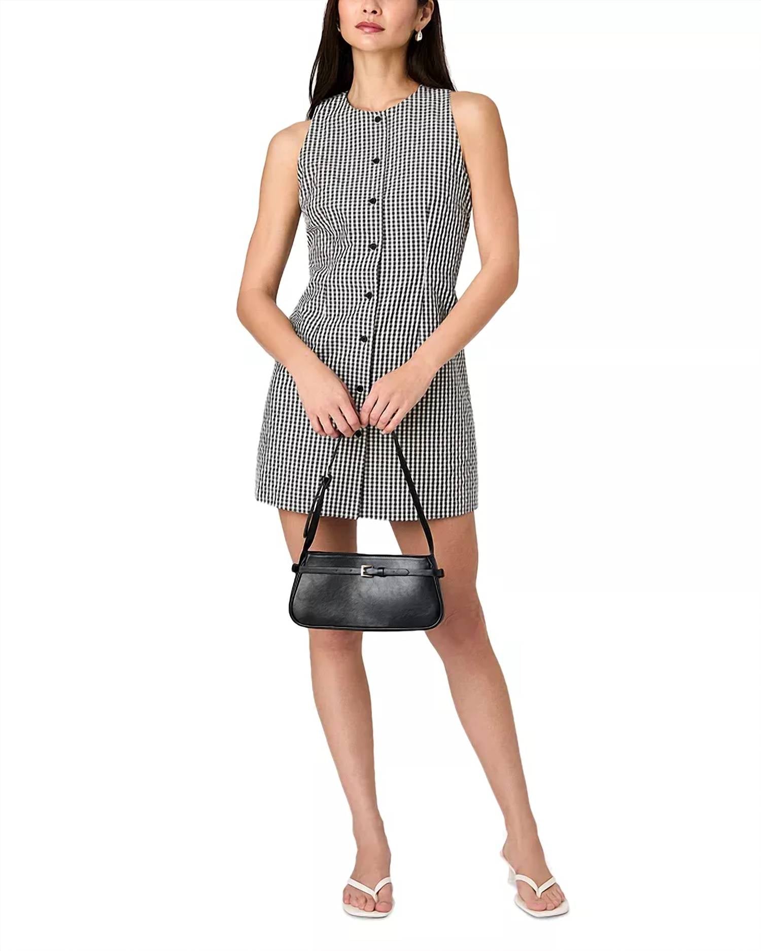 The kind of easy and flattering dress you'll be reaching for all season long. The Black Gingham Mini Dress by French Connection combines a timeless pattern with a sleek silhouette designed for versatile styling. It's sleeveless with a classic gingham print and crafted in a 52% cotton, 48% polyester blend for a flattering fit. The dress measures approximately 35 inches in length and features button front closures and a round neck. Originating from abroad, it’s perfect for a variety of occasions, and is easy to care for with simple machine wash instructions. Model is 5'10" and is shown wearing a size small.