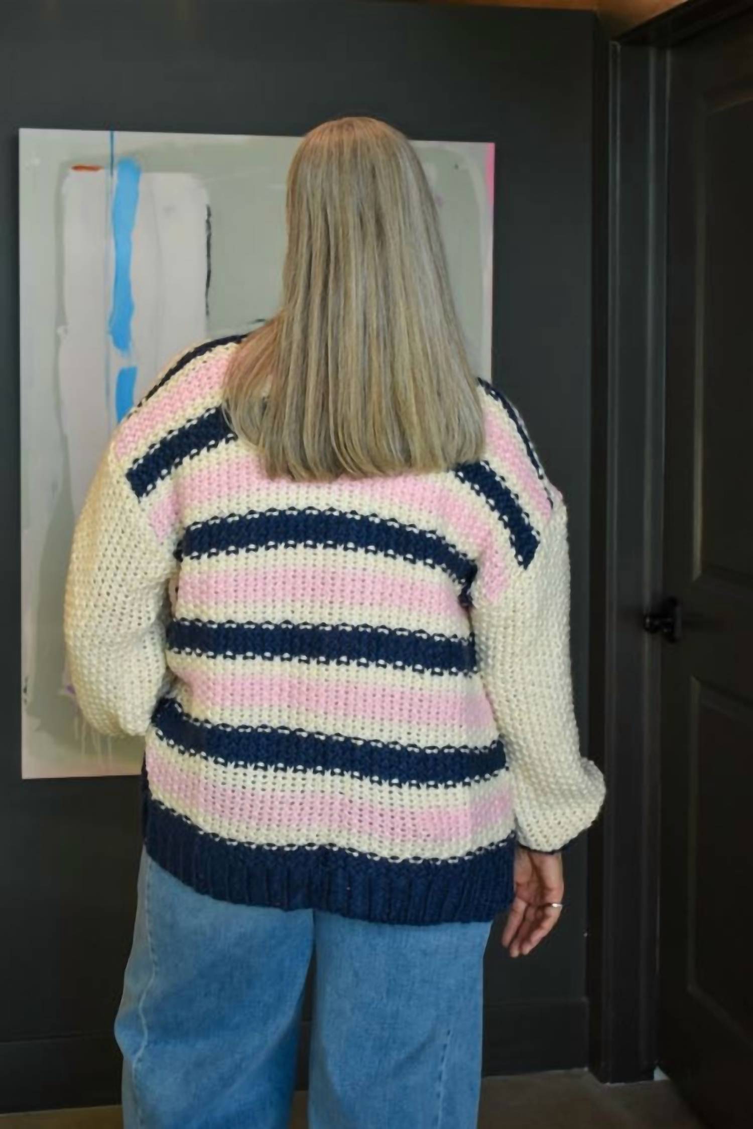 Throw this adorable cardigan over any cami or tank top. Introducing the Women's Dahlia Cardigan by FRNCH, a statement piece for your wardrobe in a delightful rose hue. Featuring long contrasting sleeves and wide stripes with a textured, striped floral pattern, this cardigan offers a loose fit for ultimate comfort. The thick knit in large ribs enhances its cozy aesthetic, complete with a classic V-neck. Closure: Button closure. Perfect for embracing the maximalist trend on your next vacation.
