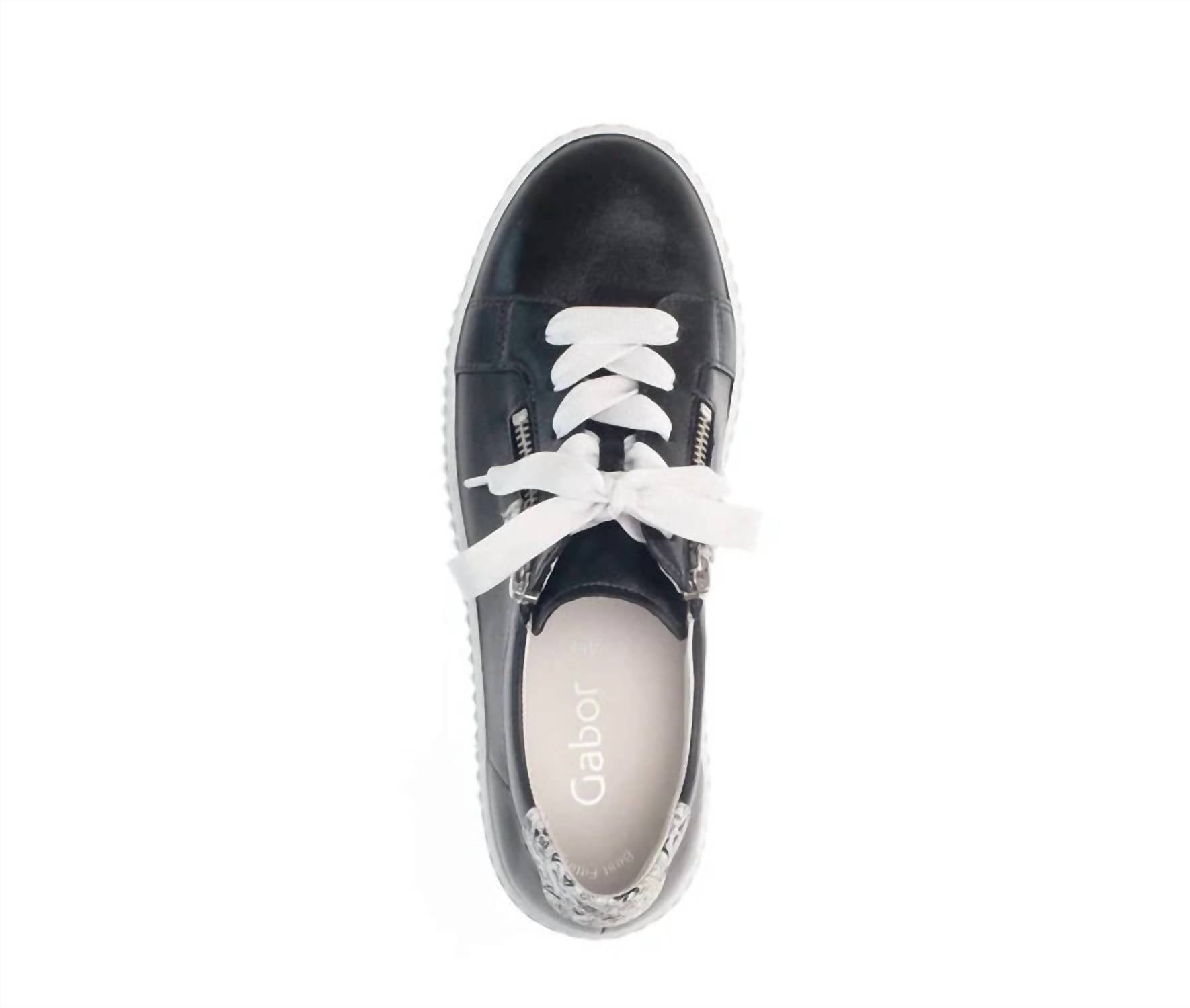 Cute, functional, and comfortable. These sneakers check all the boxes. Step out in style with the Women's Leather With Side Zip Sneaker by Gabor, perfect for casual and travel occasions. These black sneakers feature a comfortable flat heel under 1 inch and a medium width for a perfect fit. With a leather upper and a round toe design, they include both white and black laces, alongside zippers for added convenience. The shoes come with removable insoles, offering you the flexibility to insert your custom insoles for personalized comfort.