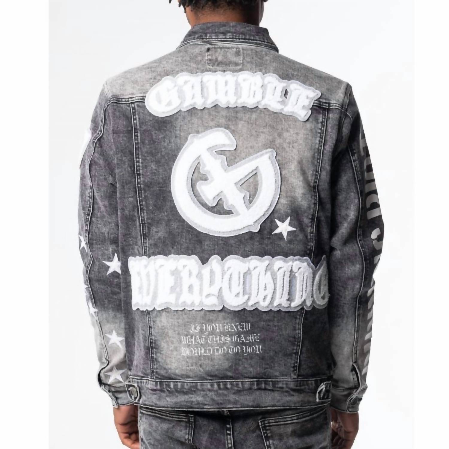Introducing the Gala Original "Gamble Everything" Jacket in a sleek black hue, perfect for adding a bold statement to any wardrobe. This men's lightweight denim jacket features long sleeves and a classic collar, with a streetwear-inspired graphic pattern. Designed with practical inside pockets and a convenient button closure. Crafted for easy maintenance, simply machine wash and tumble dry to keep it looking fresh. Ideal for a cool summer look or a laid-back back-to-school ensemble.