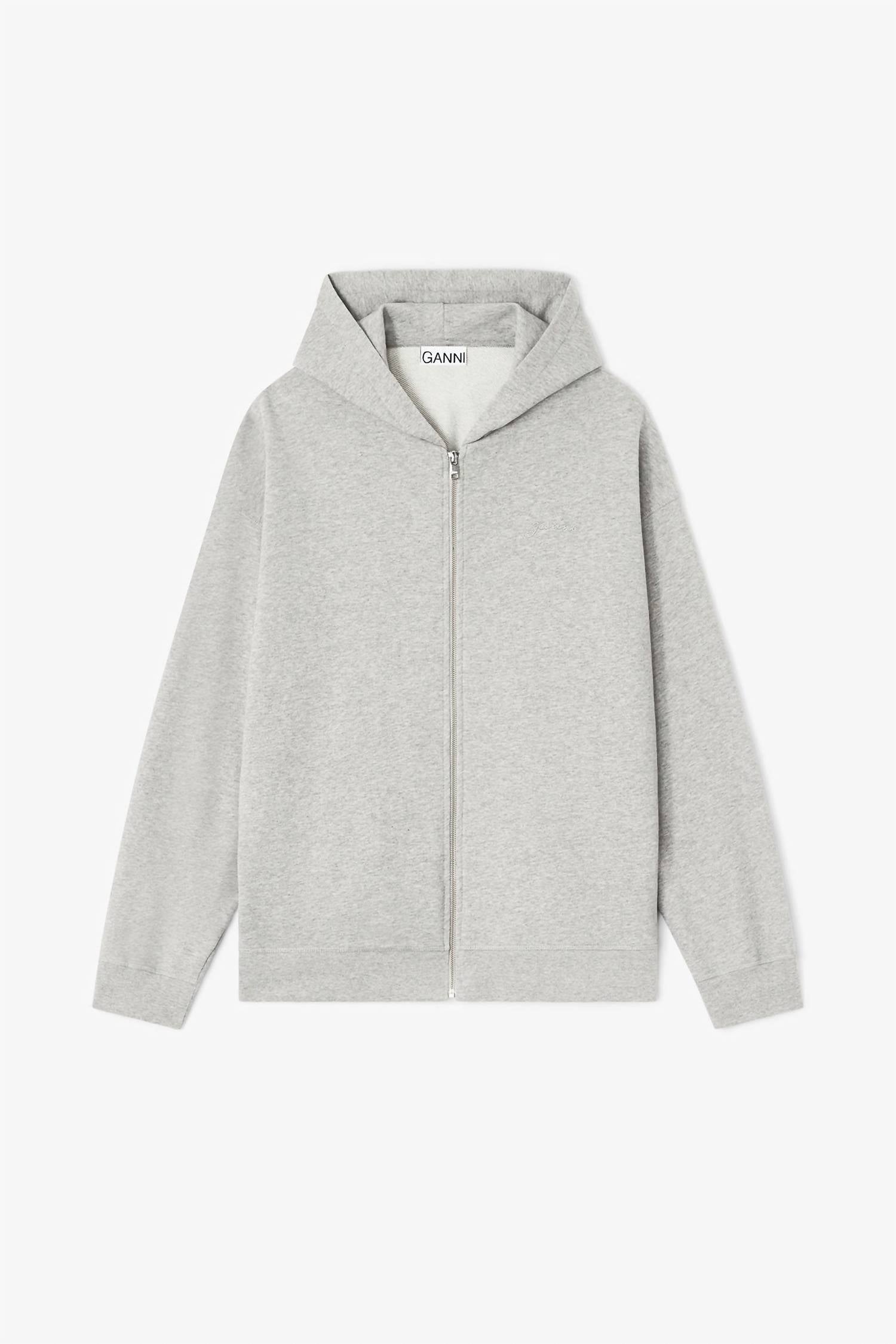 Cozy fabric, impeccable design - Meet the sweatshirt that you'll never want to take off. GANNI's Teddy Zip Hoodie is a standout piece in grey designed to create a cozy, minimalist aesthetic perfect for a chilly Thanksgiving. This women's hoodie is made from 100% organic cotton, boasting long sleeves with ribbed cuffs. It features a practical front zip closure and a hood for added warmth, while the oversized fit and graphic teddy print on the back add a playful twist. Proudly made in Portugal, care for it with a machine wash and lay flat to dry.