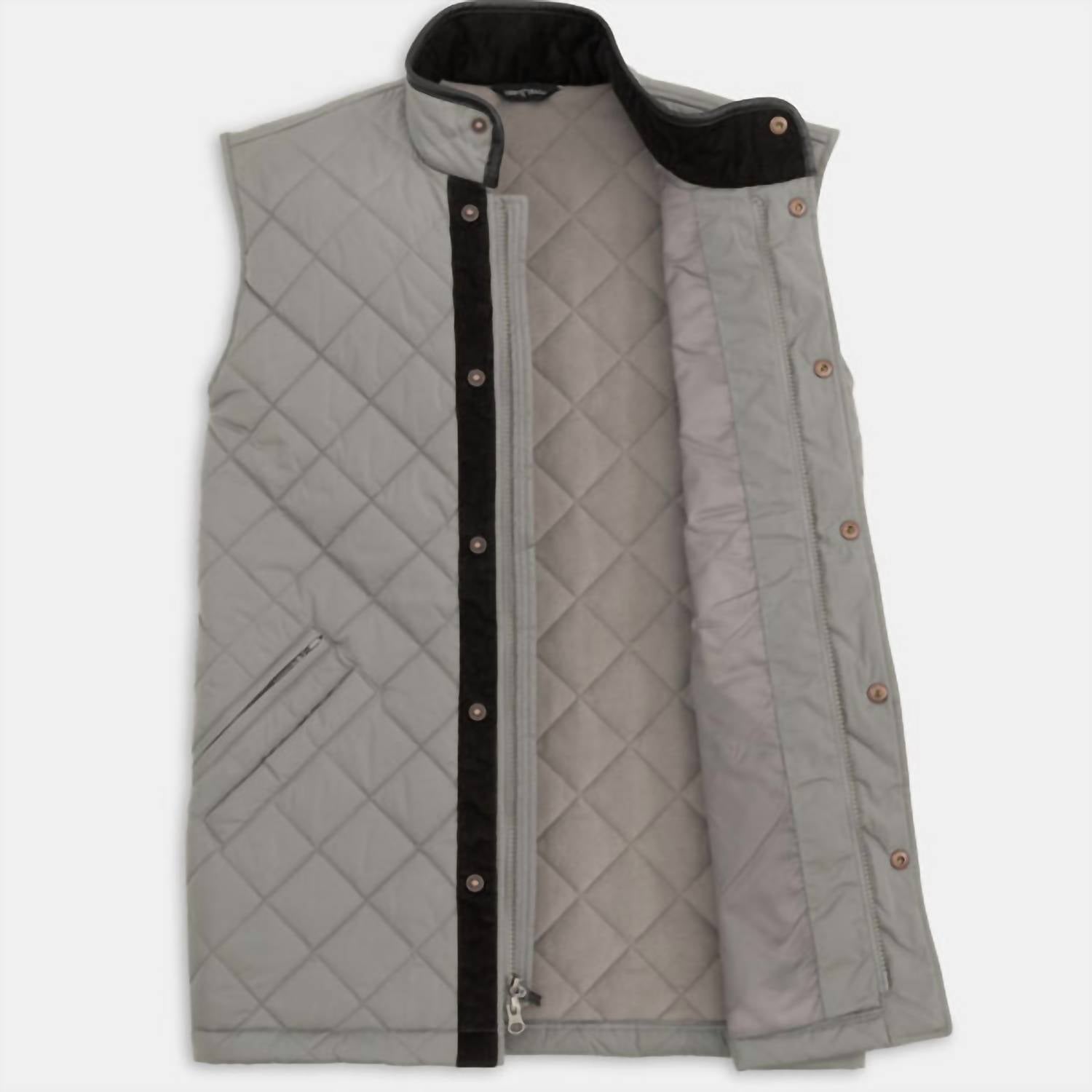 Elevate your winter wardrobe with the Northpoint Quilted Vest by GenTeal, designed for the modern adventurer. This sleeveless vest, crafted from textured polyester, features a quilted exterior and fleece lining for added warmth. Made in a sophisticated graphite color, it comes with a snap closure and two interior pockets for functionality. Detailed with corduroy trim and faux leather accents, this vest is perfect for travel and festive Thanksgiving gatherings.