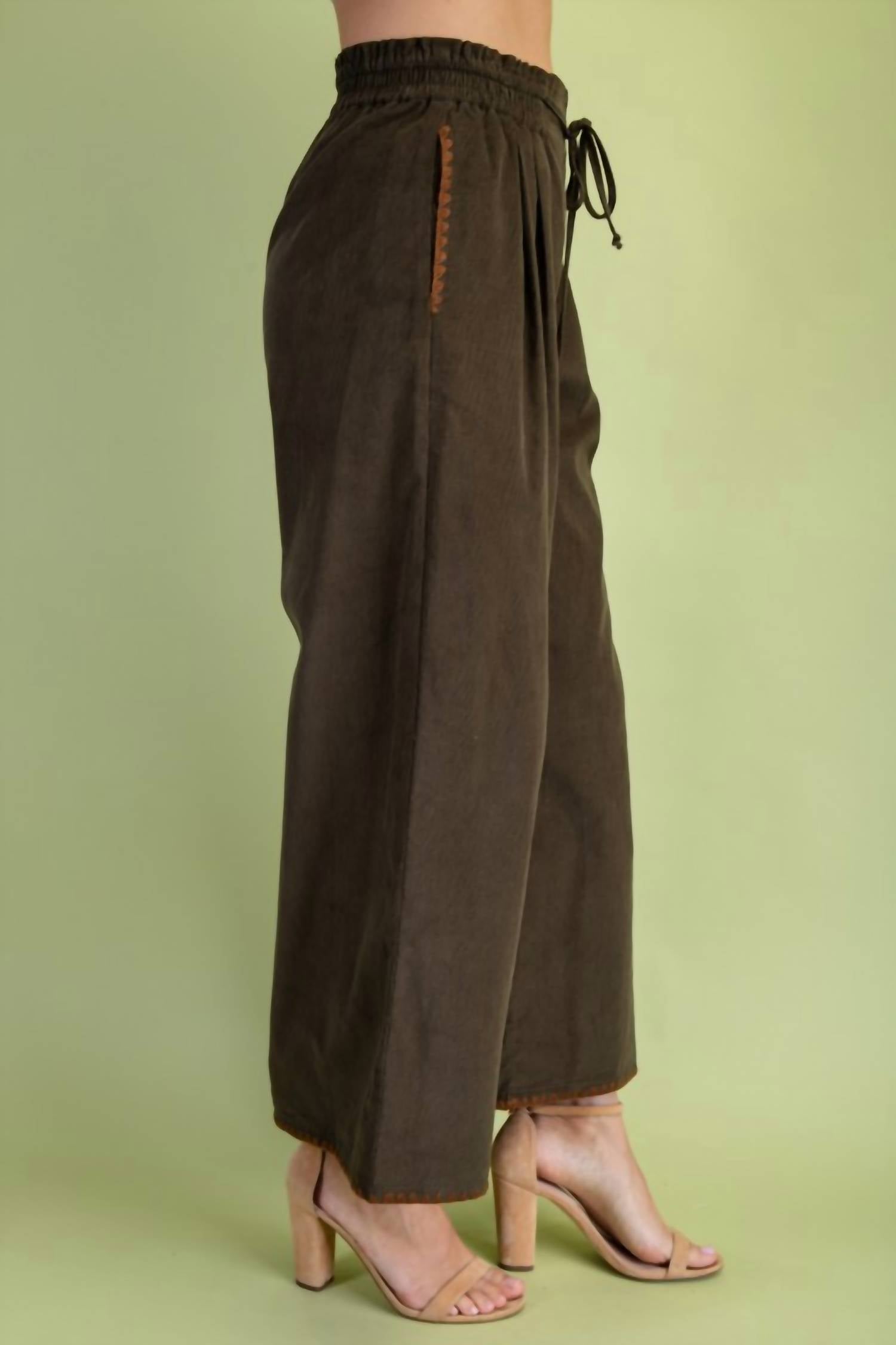 Introducing the Corduroy Relaxed Fit Pants by GiGiO, a stylish choice for your next dinner party or spring outing. Designed in a minimalist, solid olive hue, these pants feature a comfortable pull-on closure, perfect for laid-back elegance. Crafted from 80% Rayon and 20% Nylon, they boast a wide-leg silhouette with decorative stitching details. For best care, machine wash and lay flat to dry.