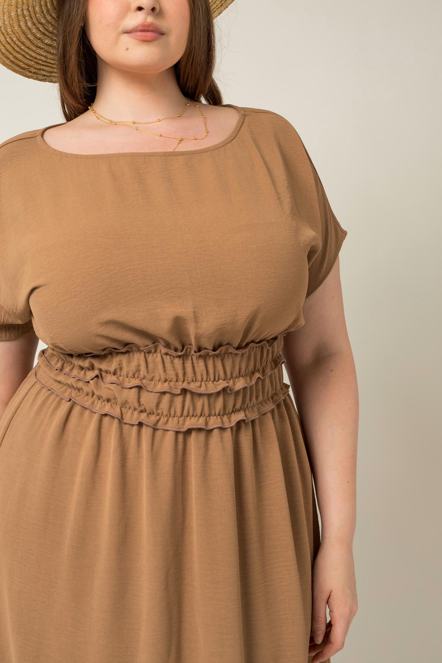 The perfect length dress does exist. Introducing the In The Mood Mocha Midi Dress by GILLI, designed to give you an air of effortless elegance. This minimalist, solid-colored dress features a scoop neck and short sleeves for comfort and style. Crafted from 100% polyester with a flattering A-line silhouette, it's perfect for summer occasions like church gatherings. Designed with a pull-on closure, it offers a fuss-free wear experience.