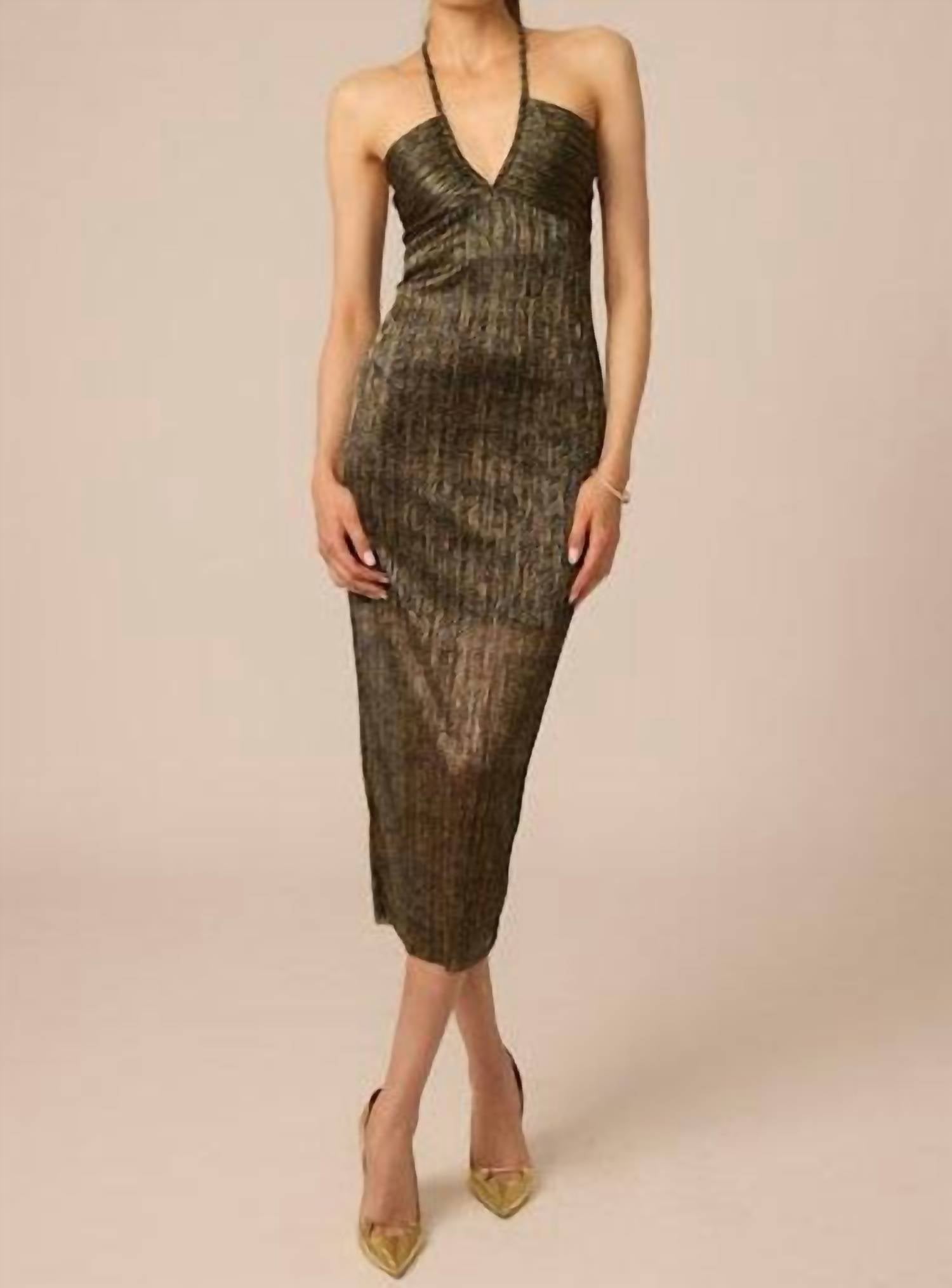 The perfect length dress does exist. Meet the Delora Midi Dress by Gilner Farrar, designed to captivate in green with gold metallic crinkle. This sleeveless, bodycon piece boasts a semi-sheer lurex stripe overlay and a fitted silhouette that shimmers with every move. The halter neckline and deep V-front create an elongating effect, while a partially lined mini-length underlayer adds intrigue. Composition: 60% Polyester, 40% Metallic. Closure: Tie closure. Care: Dry clean only.