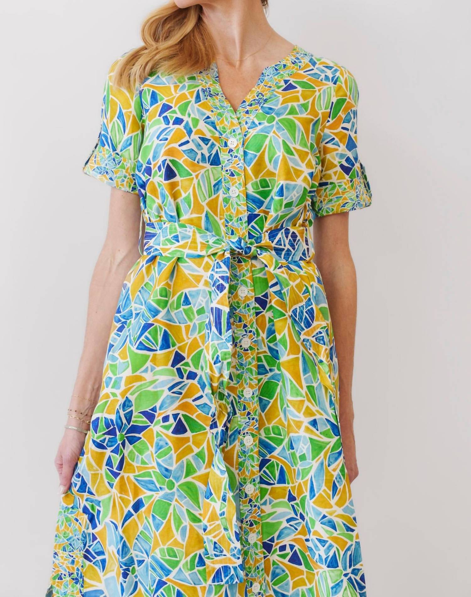 A midi dress so versatile, your options for wearing it are endless. Experience effortless summer style with the GILNER FARRAR Helena Dress, featuring a striking Ravenna print in vibrant yellow and blue geometric patterns. This A-line midi dress comes with short sleeves and a flattering V-neck, offering a retro flair with its button closure. Crafted from a breathable linen blend of 53% linen and 47% rayon, it ensures comfort throughout your vacation days. Made for easy care, it requires dry cleaning to maintain its boho chic vibrancy and structure.