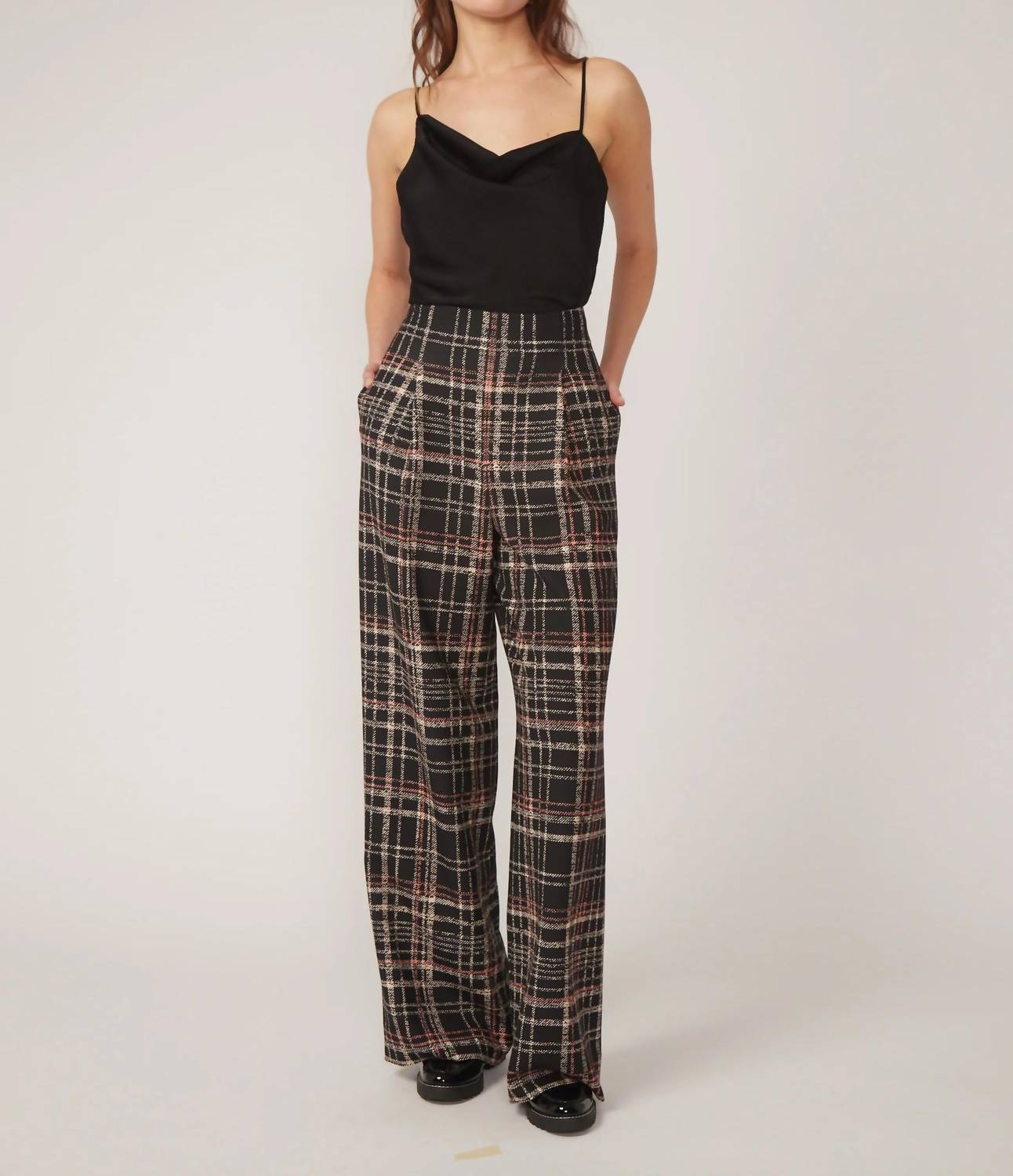 The Milena Pants by GILNER FARRAR offer a high-waisted design with a wide waistband, ensuring a comfortable fit for various occasions. Crafted with a loose fit and featuring a straight wide leg, these pants present a stylish plaid and check pattern in black, white, and orange. Equipped with pockets and a side zipper closure, they are an effortless choice for both work and leisure. Runs big, so consider sizing down for the perfect fit.