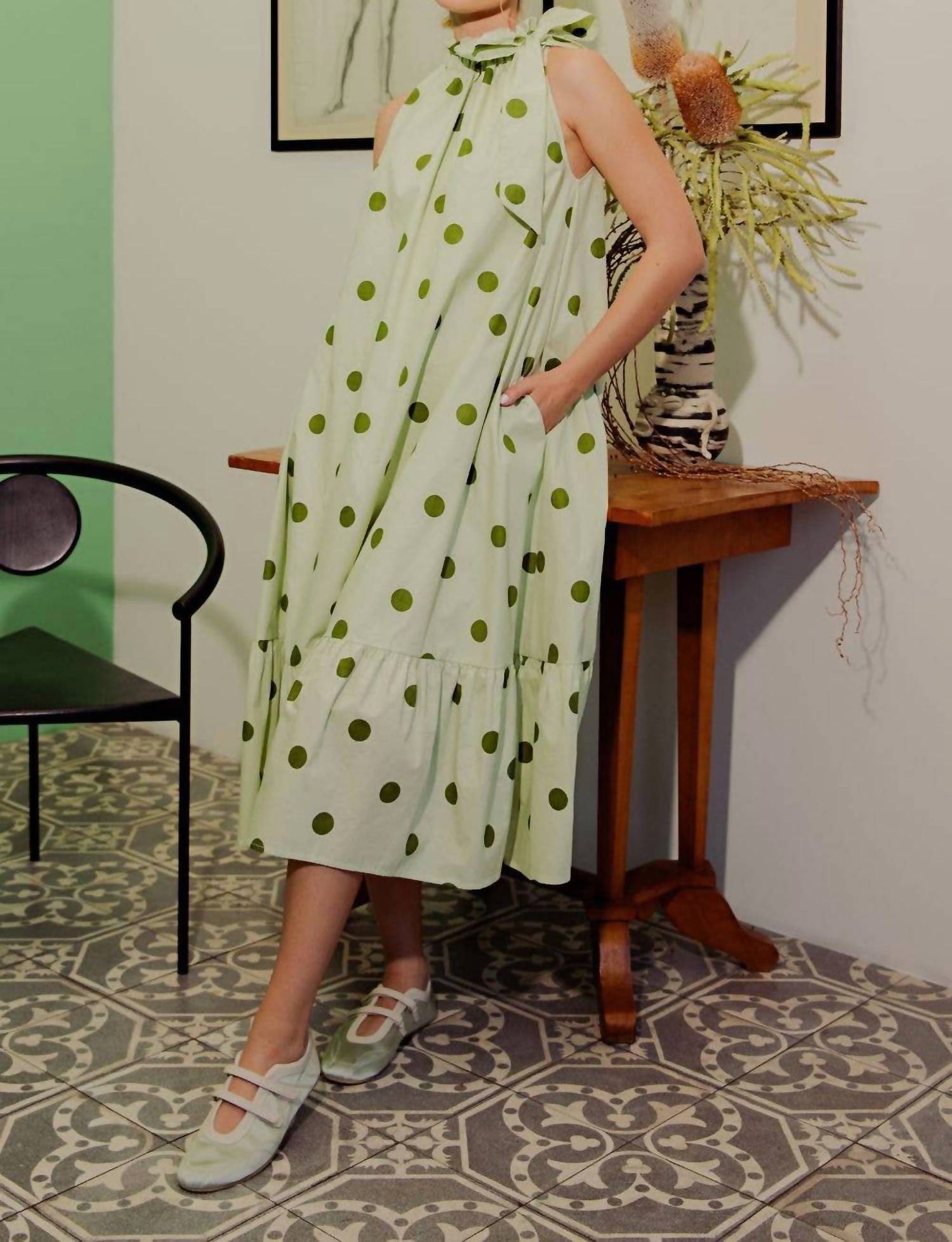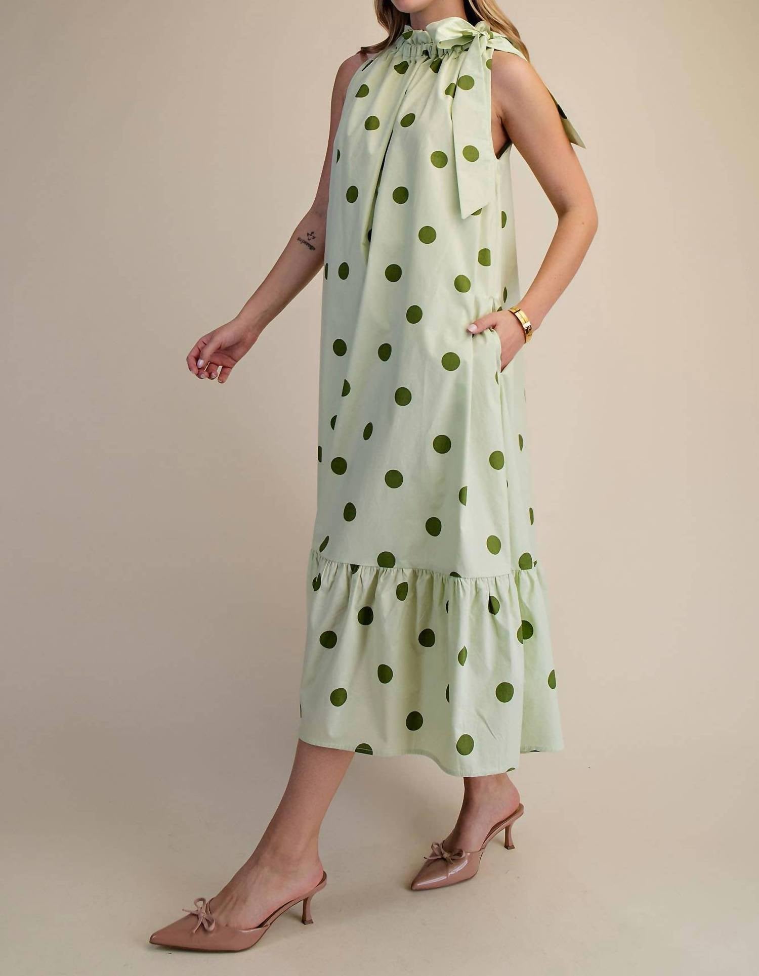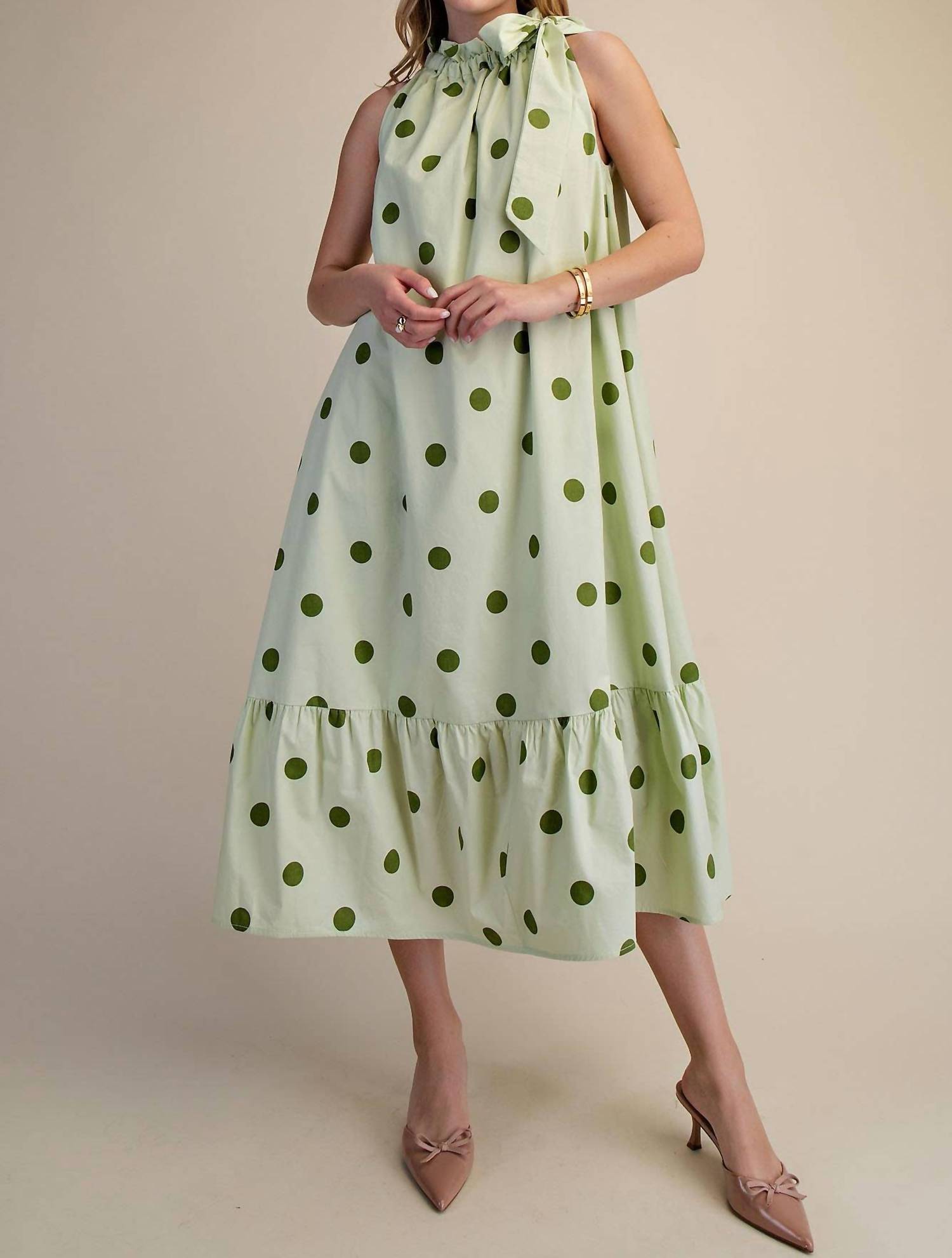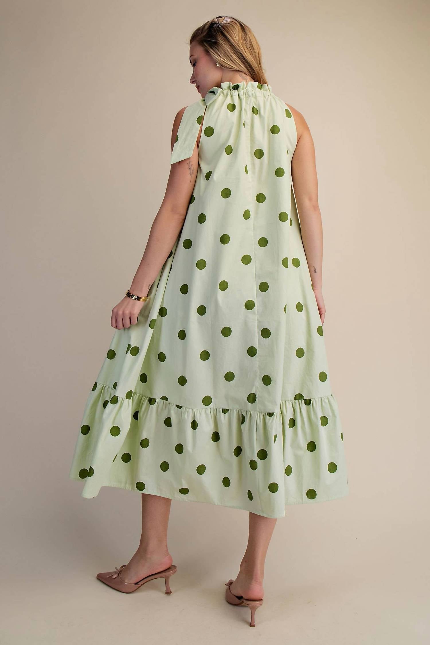 The perfect length dress does exist. Embrace elegance with the Ruffle Tie Neck Sleeveless Midi Dress by GLAM, perfect for summer cocktail parties. This green A-line dress, made from 100% cotton, boasts a charming polka dot pattern and a mockneck design. The sleeveless, minimalist silhouette adds a chic touch, while the tie closure ensures a flattering fit. Care for this exquisite piece with ease by machine washing and line drying. Model is 5'8" and wearing a size small.