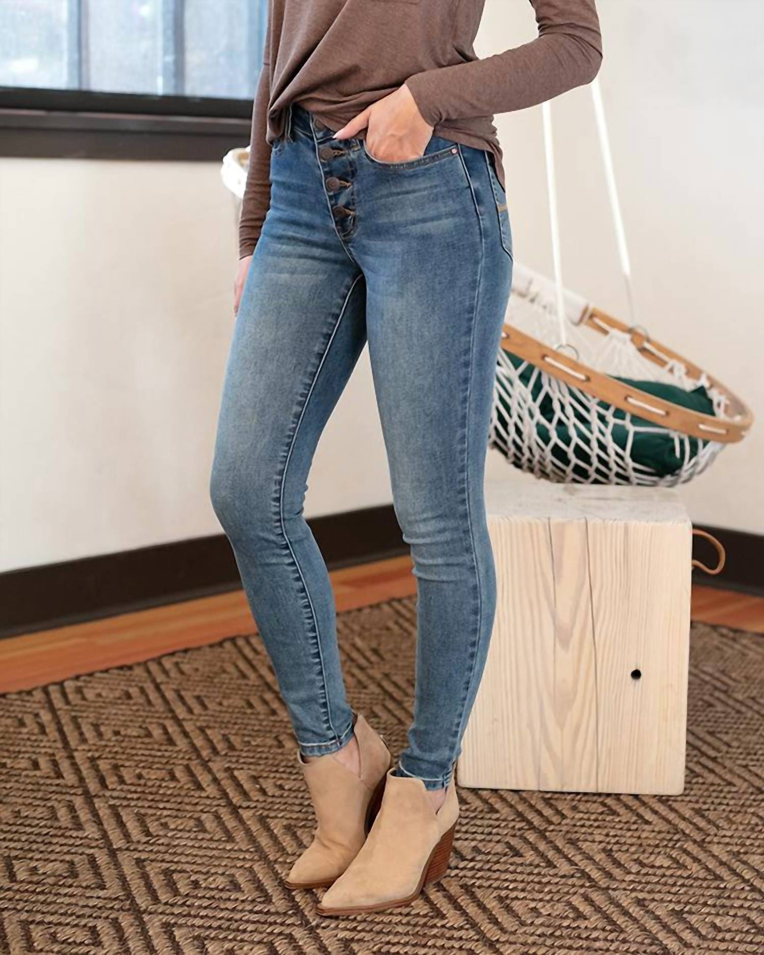 A skinny jean that is both flatering and comfortable. We love this style because it works great with boots, or without! Introducing the Grace and Lace Non-distressed Designer Denim Button Fly Jeans in a chic medium wash blue. These women's skinny jeans feature a flattering high-rise design with a slim fit and a trendy button closure for a modern streetwear vibe. Crafted from a comfortable cotton blend (68% Cotton, 27% Polyester, 3% Viscose, 2% Spandex), they're designed to elongate the leg with their sleek skinny leg style and detailed with practical pockets. Ideal for holiday parties or casual summer outings, these jeans are easy to care for with machine wash instructions and tumble dry compatibility, maintaining a polished look with minimal effort.