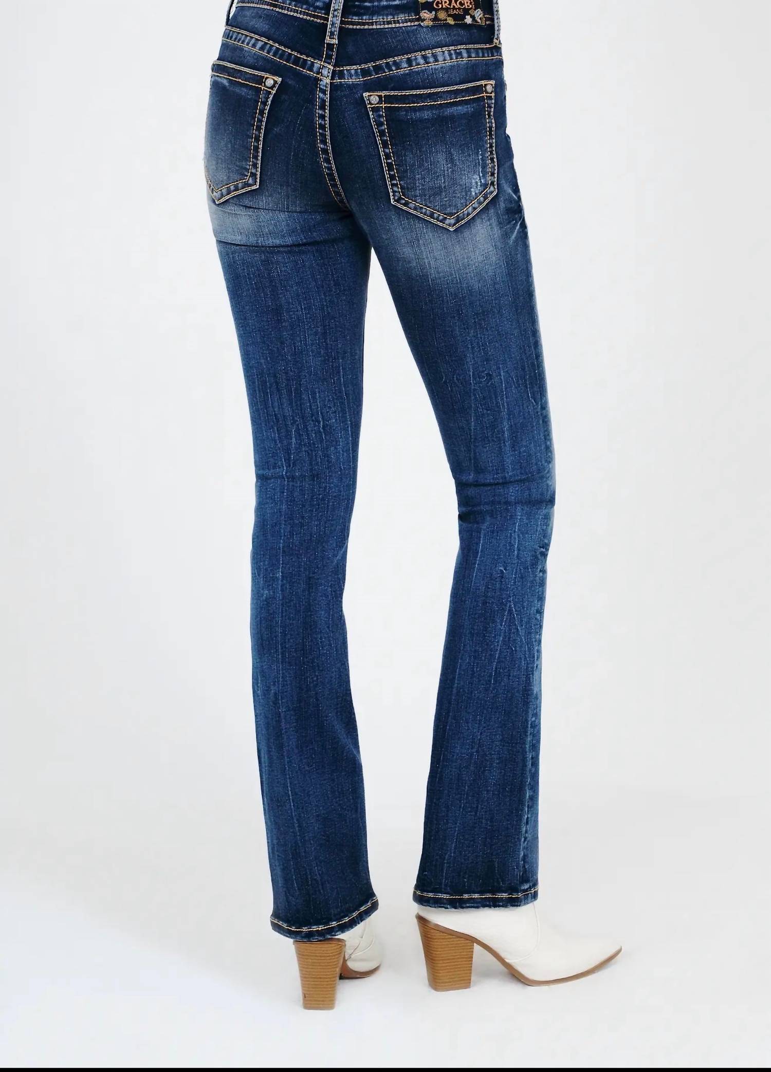 If you're looking for boot-cut, this is the jean for you. The Grace in LA women’s boot cut jean is an easy fit. It’s right at the waist to create a hip hugger field on the hips and thighs. The gene is an American steer embroidery detail with medium blue wash. They look like they’ve been yours forever with details like distressing sanding and whispering, so go ahead and make it official your new boat cut Jen is just a click away.