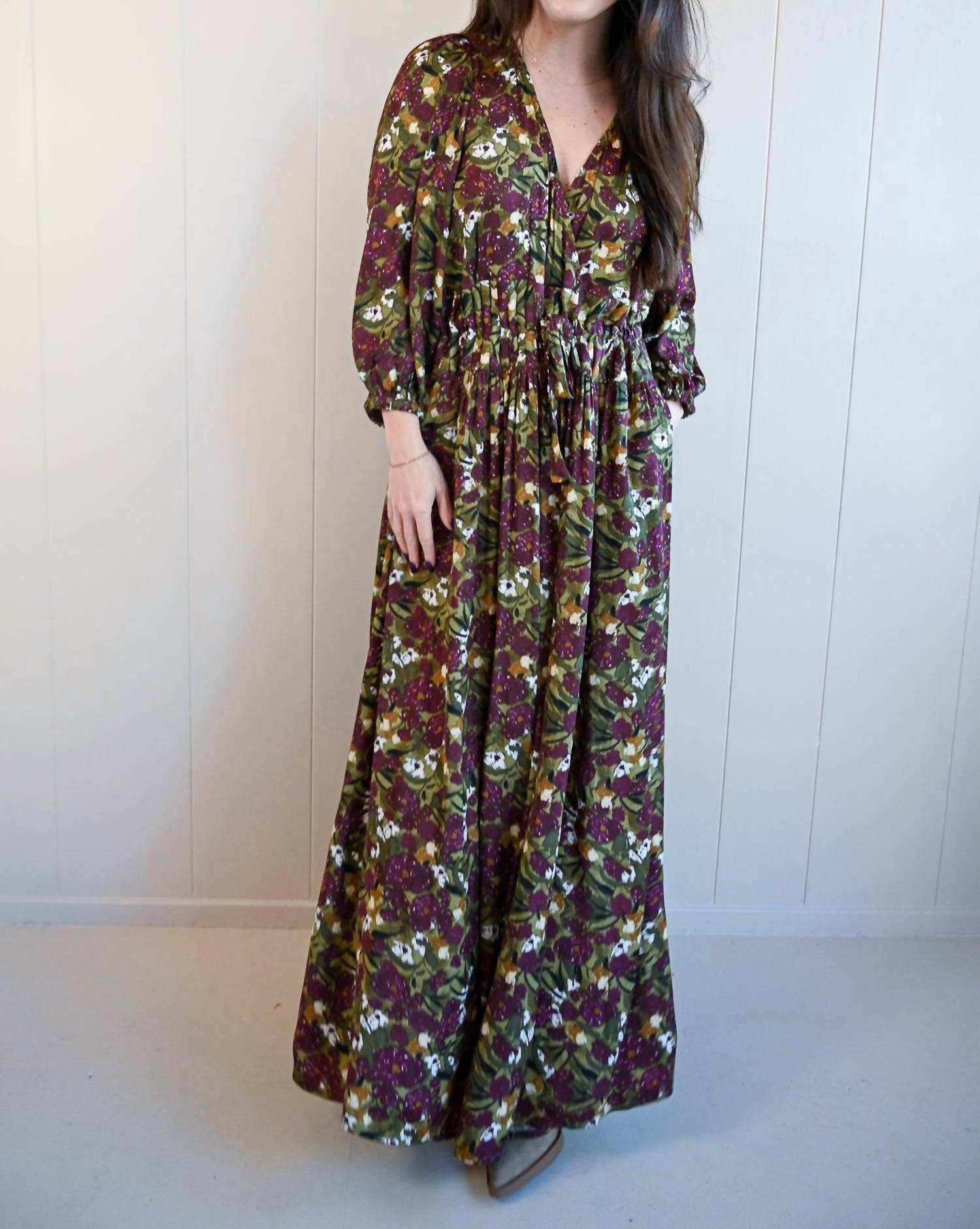 Style this maxi with your favorite statement necklace and sandals for the perfect look. Indulge in the timeless elegance of the Women's Dewey Avenue Pleat Waist Floral Maxi Dress by GRADE & GATHER. This green dress features long sleeves and showcases a stunning floral pattern, perfect for a variety of occasions. Made from 100% polyester, it offers a flattering pleated waist and a practical pull-on closure, gracefully highlighted by its shift silhouette and V-neckline. Accentuated with pockets for added convenience, this vacation-ready piece is a stylish maximalist choice, ready to transition effortlessly from season to season. Model is 5'0'' and is wearing a size small.