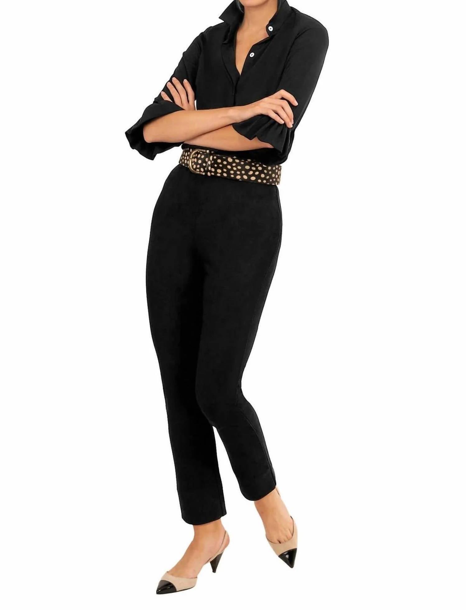 A perfectly tailored straight leg that you'll want in every color! Introducing the Gripeless Ultra Suede Pull On Pants by Gretchen Scott, a sleek addition to your wardrobe in classic black. These women's pants feature a solid straight leg, a slim fit, and a hidden elastic waistband for an easy pull-on style. Crafted from 95% Polyester and 5% Elastane, they include a 27" inseam and a 2" back ankle slit. Originating from China, these pants are machine washable and can be tumble dried for easy care.