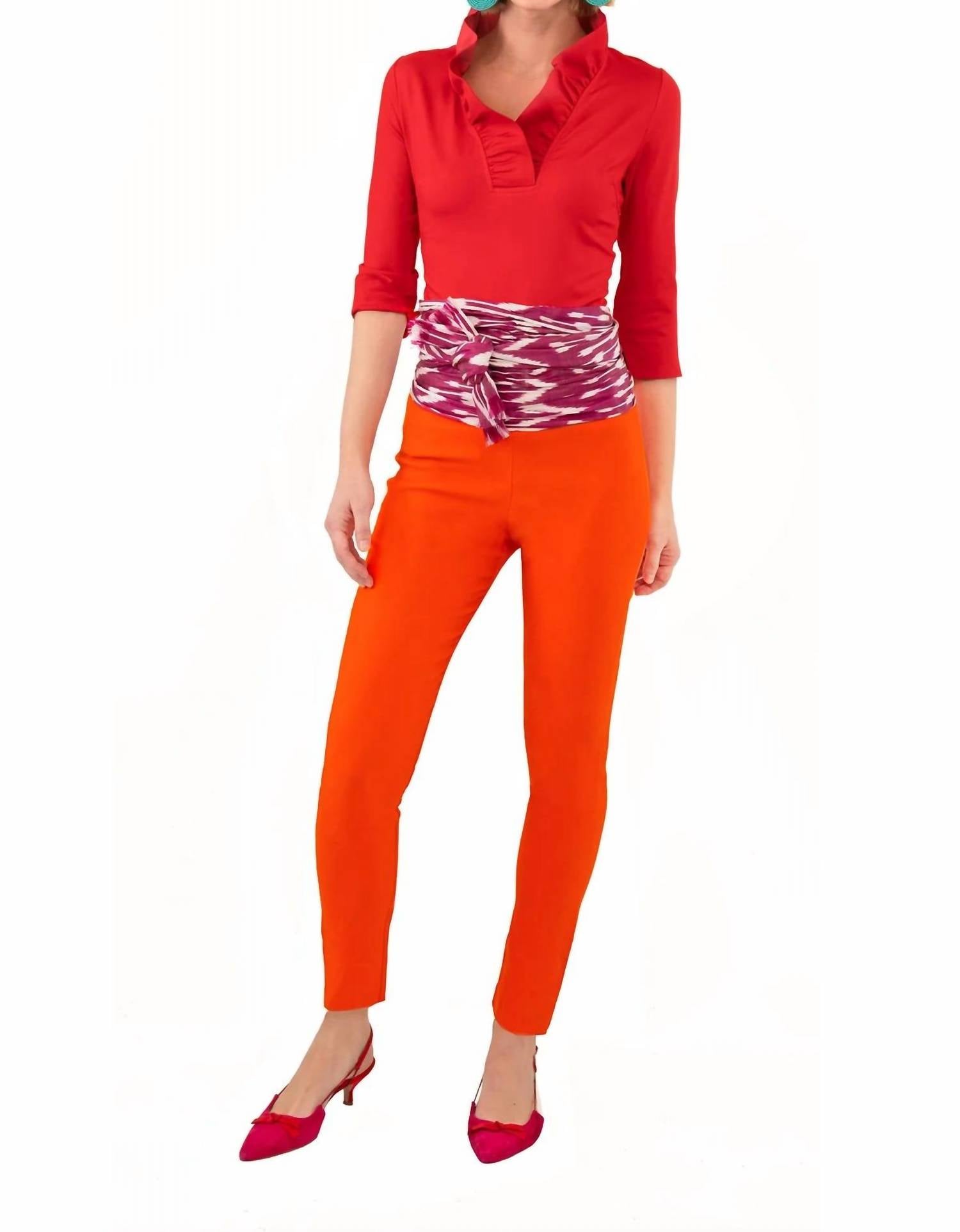 The perfect long sleeve tee that goes with just about anything. Introducing the Jersey Ruffneck Quarter Sleeve Top by Gretchen Scott, a chic statement in solid red with three-quarter sleeves and turn-back cuffs. Crafted from soft stretch jersey fabric, this top features a bold stand-up ruffle neck and inside contrast back panel, measuring 25" in length. Composition: 97% Polyester, 3% Elastane. Care: Machine wash cold, cool tumble dry or dry clean. Closure: Pull on. Ideal for a dinner party, this minimalist piece combines flirty charm with everyday comfort.